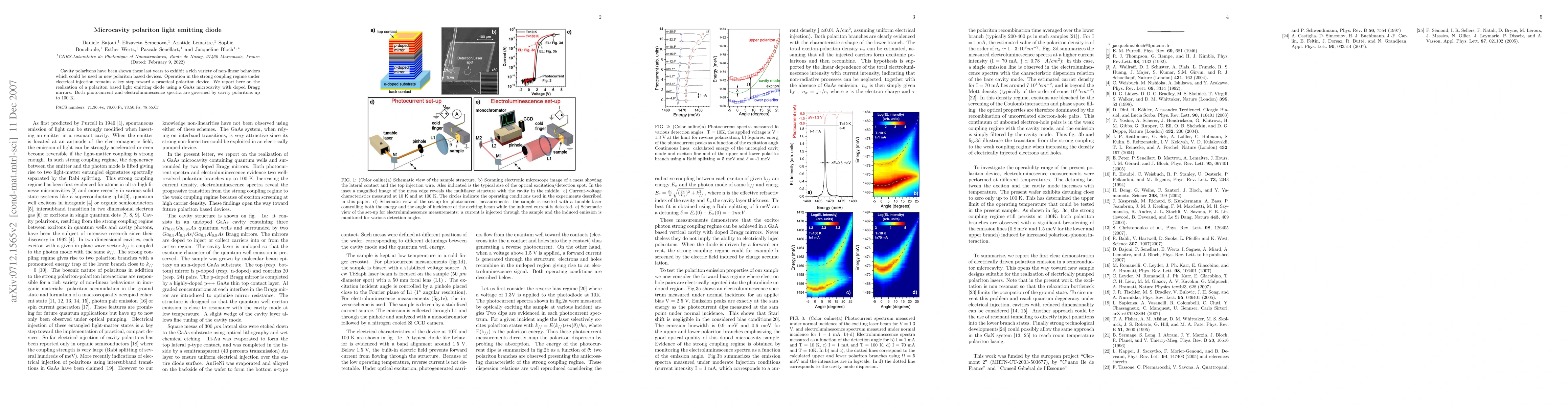 The paper reports a novel electrically driven polariton emission device based on a GaAs microcavity with doped Bragg mirrors, demonstrating strong coupling regime operation up to 100 K.