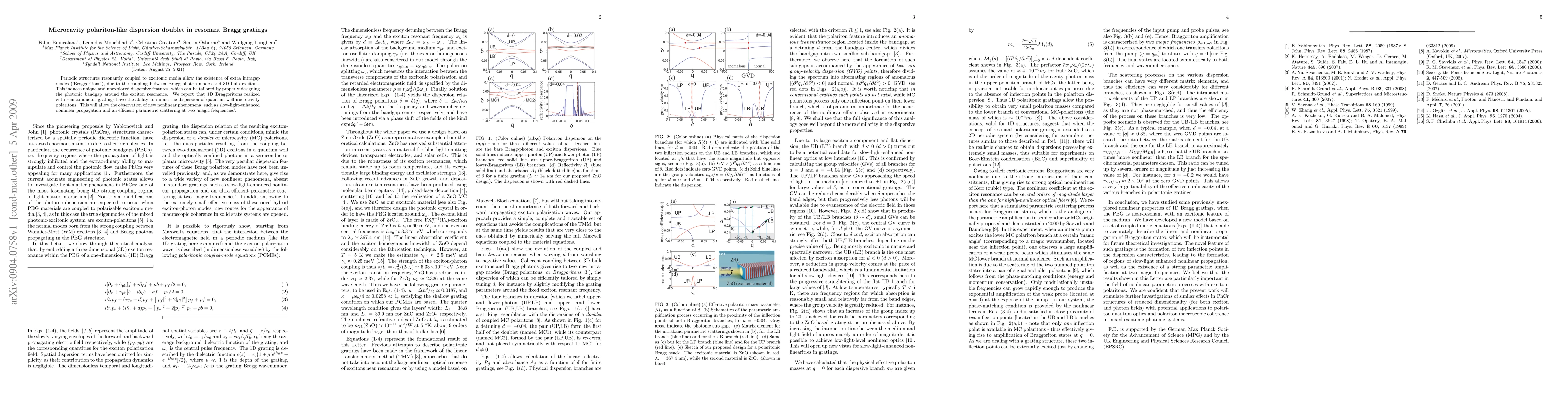 Periodic structures resonantly coupled to excitonic media allow the existence of extra intragap modes ('Braggoritons'), due to the coupling between Bragg photon modes and 3D bulk excitons. This induces unique and unexplored dispersive features, which can be tailored by properly designing the photonic bandgap around the exciton resonance. We report that one-dimensional Braggoritons realized with semiconductor gratings have the ability to mimic the dispersion of quantum-well microcavity polaritons. This will allow the observation of new nonlinear phenomena, such as slow-light-enhanced nonlinear propagation and an efficient parametric scattering at two 'magic frequencies'.