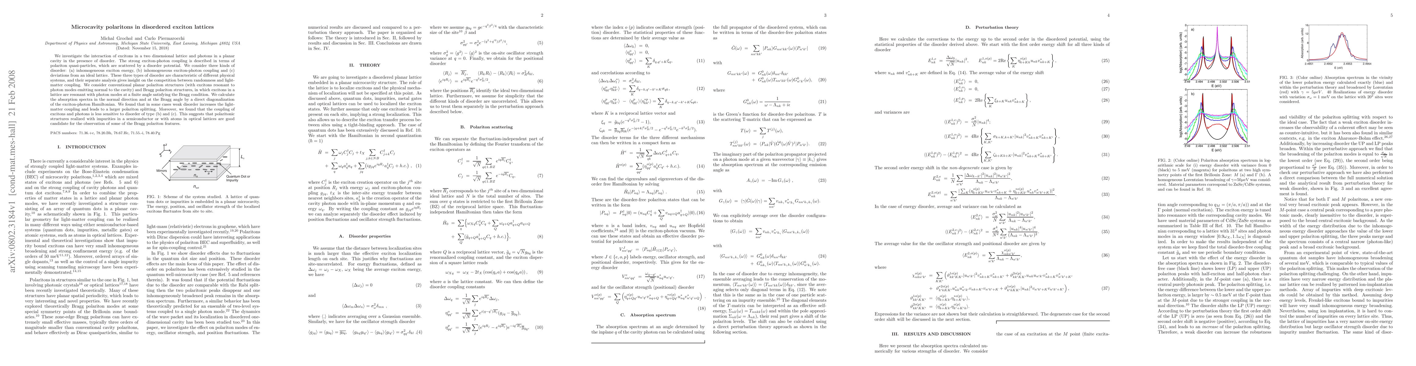 We investigate the interaction of excitons in a two dimensional lattice and photons in a planar cavity in the presence of disorder. The strong exciton-photon coupling is described in terms of polariton quasi-particles, which are scattered by a disorder potential. We consider three kinds of disorder: (a) inhomogeneous exciton energy, (b) inhomogeneous exciton-photon coupling and (c) deviations from an ideal lattice. These three types of disorder are characteristic of different physical systems, and their separate analysis gives insight on the competition between randomness and light-matter coupling. We consider conventional planar polariton structures (with excitons resonant to photon modes emitting normal to the cavity) and Bragg polariton structures, in which excitons in a lattice are resonant with photon modes at a finite angle satisfying the Bragg condition. We calculate the absorption spectra in the normal direction and at the Bragg angle by a direct diagonalization of the exciton-photon Hamiltonian. We found that in some cases weak disorder increases the light-matter coupling and leads to a larger polariton splitting. Moreover, we found that the coupling of excitons and photons is less sensitive to disorder of type (b) and (c). This suggests that polaritonic structures realized with impurities in a semiconductor or with atoms in optical lattices are good candidate for the observation of some of the Bragg polariton features.