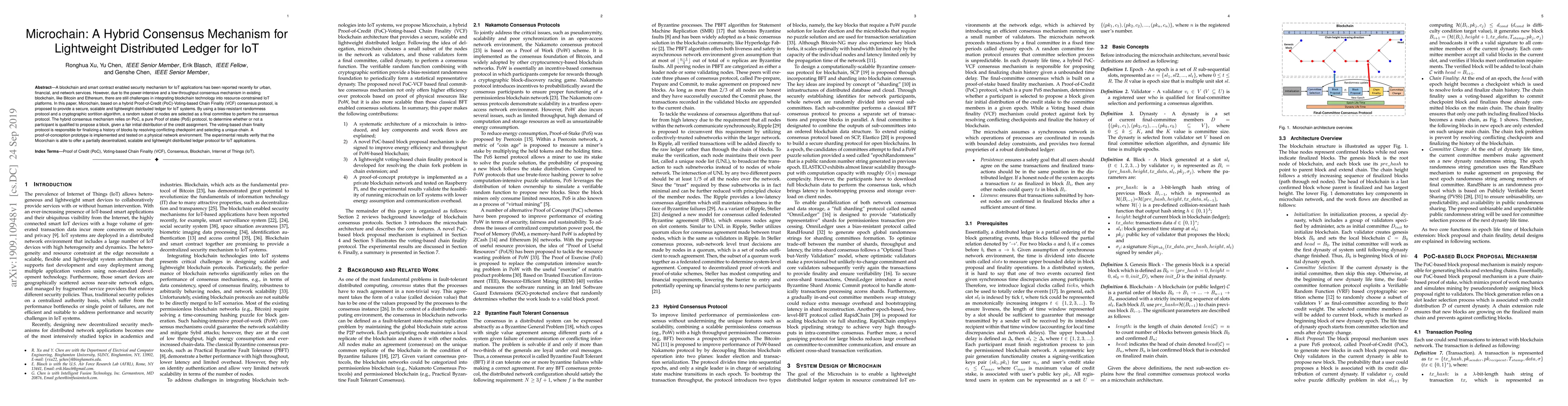 Microchain proposes a hybrid consensus mechanism combining Proof-of-Credit and Voting-based Chain Finality for a lightweight distributed ledger suitable for IoT systems. Experimental results show it offers a scalable, secure, and partially decentralized solution for resource-constrained IoT applications.