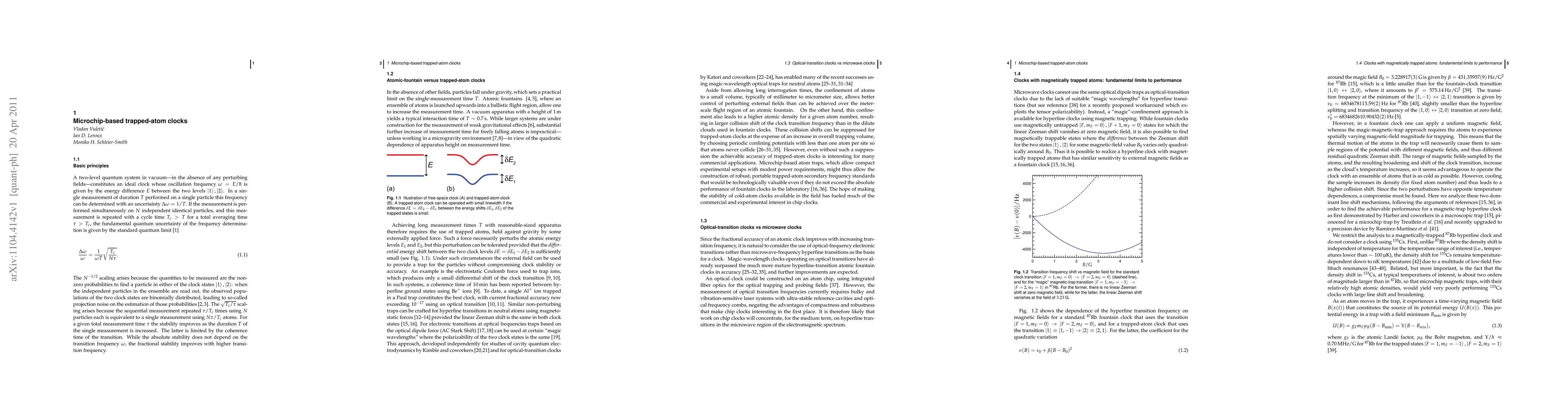 Summary: This chapter explores the fundamental principles and comparisons of different types of microchip-based trapped-atom clocks, emphasizing atomic-fountain versus trapped-atom designs, optical versus microwave clocks, and the fundamental limits and experimental demonstrations of clocks using magnetically trapped atoms, along with their readout methods and applications of spin squeezing.
