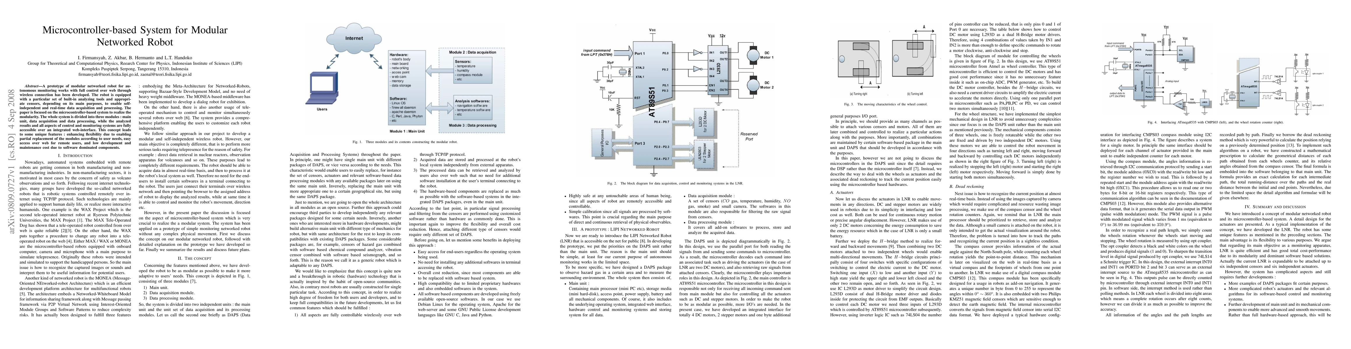 A prototype of modular networked robot for autonomous monitoring works with full control over web through wireless connection has been developed. The robot is equipped with a particular set of built-in analyzing tools and appropriate censors, depending on its main purposes, to enable self-independent and real-time data acquisition and processing. The paper is focused on the microcontroller-based system to realize the modularity. The whole system is divided into three modules : main unit, data acquisition and data processing, while the analyzed results and all aspects of control and monitoring systems are fully accessible over an integrated web-interface. This concept leads to some unique features : enhancing flexibility due to enabling partial replacement of the modules according to user needs, easy access over web for remote users, and low development and maintenance cost due to software dominated components.