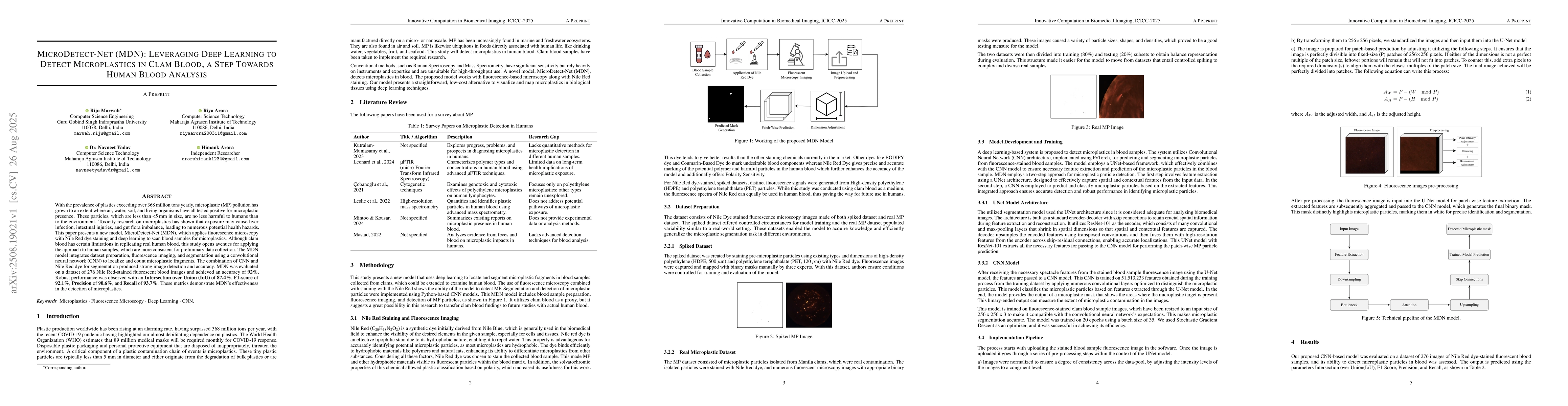 With the prevalence of plastics exceeding 368 million tons yearly, microplastic pollution has grown to an extent where air, water, soil, and living organisms have all tested positive for microplastic presence. These particles, which are smaller than 5 millimeters in size, are no less harmful to humans than to the environment. Toxicity research on microplastics has shown that exposure may cause liver infection, intestinal injuries, and gut flora imbalance, leading to numerous potential health hazards. This paper presents a new model, MicroDetect-Net (MDN), which applies fluorescence microscopy with Nile Red dye staining and deep learning to scan blood samples for microplastics. Although clam blood has certain limitations in replicating real human blood, this study opens avenues for applying the approach to human samples, which are more consistent for preliminary data collection. The MDN model integrates dataset preparation, fluorescence imaging, and segmentation using a convolutional neural network to localize and count microplastic fragments. The combination of convolutional networks and Nile Red dye for segmentation produced strong image detection and accuracy. MDN was evaluated on a dataset of 276 Nile Red-stained fluorescent blood images and achieved an accuracy of ninety two percent. Robust performance was observed with an Intersection over Union of 87.4 percent, F1 score of 92.1 percent, Precision of 90.6 percent, and Recall of 93.7 percent. These metrics demonstrate the effectiveness of MDN in the detection of microplastics.