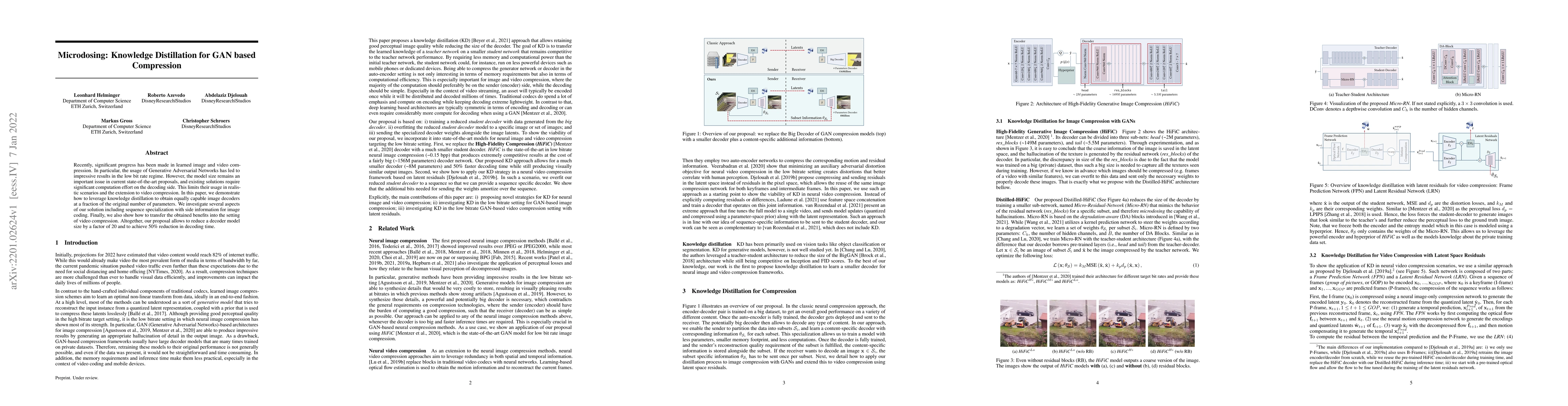 Recently, significant progress has been made in learned image and video compression. In particular the usage of Generative Adversarial Networks has lead to impressive results in the low bit rate regime. However, the model size remains an important issue in current state-of-the-art proposals and existing solutions require significant computation effort on the decoding side. This limits their usage in realistic scenarios and the extension to video compression. In this paper, we demonstrate how to leverage knowledge distillation to obtain equally capable image decoders at a fraction of the original number of parameters. We investigate several aspects of our solution including sequence specialization with side information for image coding. Finally, we also show how to transfer the obtained benefits into the setting of video compression. Overall, this allows us to reduce the model size by a factor of 20 and to achieve 50% reduction in decoding time.