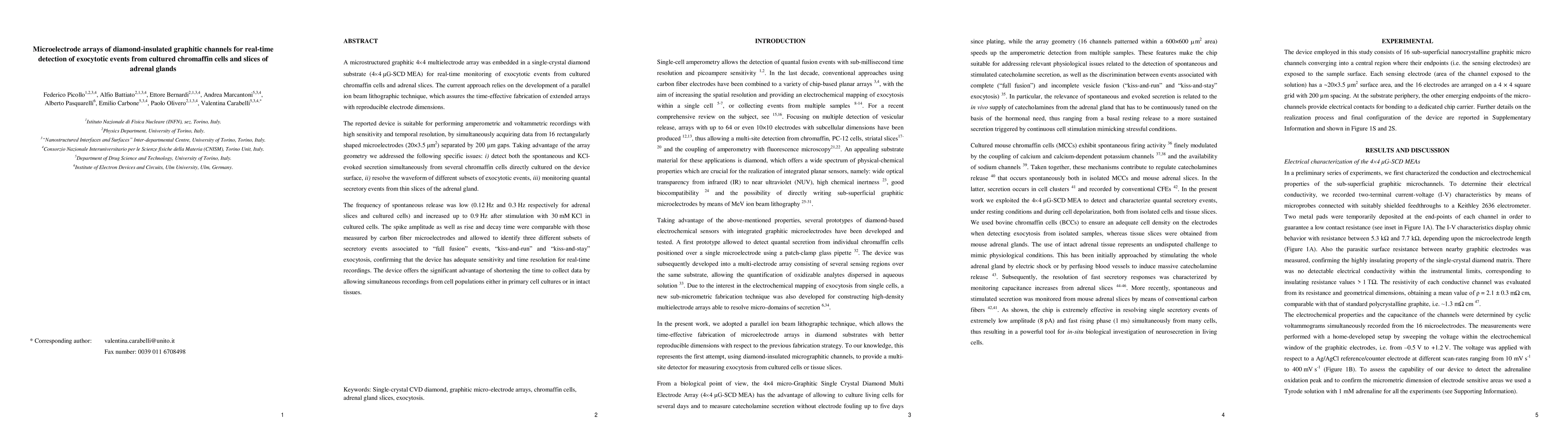 This paper presents a 4x4 multielectrode array embedded in a diamond substrate for real-time monitoring of exocytotic events from cultured chromaffin cells and adrenal slices. The device enables high-sensitivity, simultaneous recordings from multiple cells, distinguishing different types of exocytotic events with comparable accuracy to carbon fiber microelectrodes.