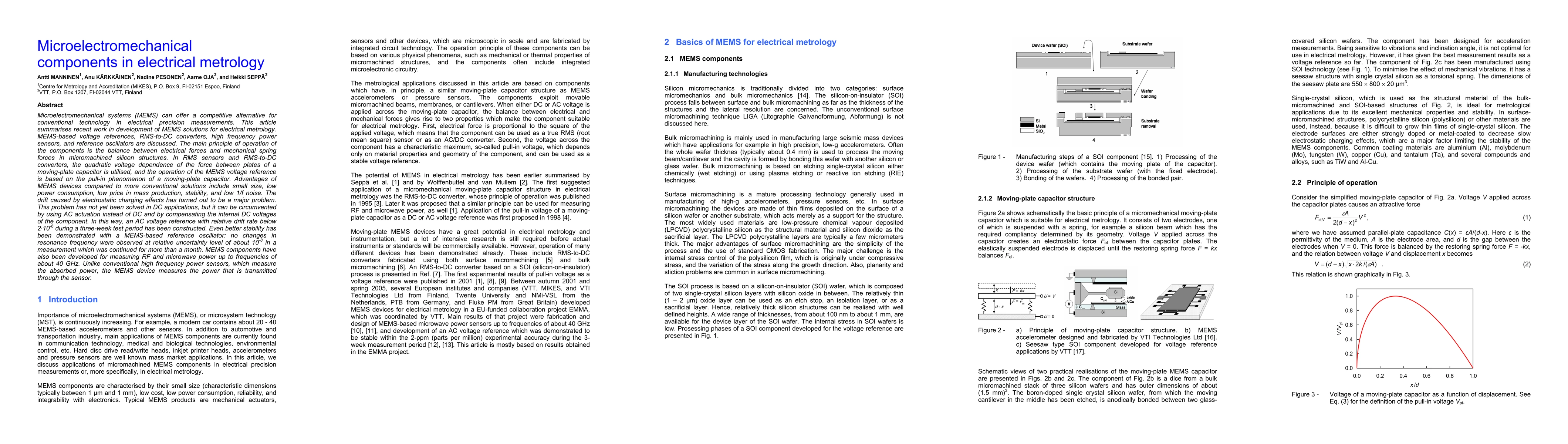 Researchers developed MEMS components for electrical metrology, offering small size, low power consumption, and stability in voltage references, RMS-to-DC converters, high frequency power sensors, and reference oscillators.