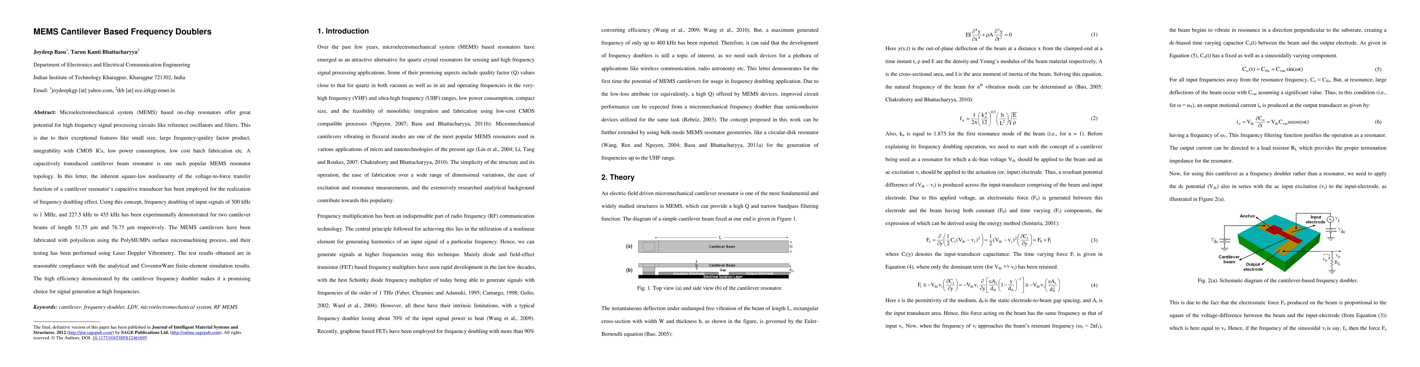 This paper explores the use of MEMS cantilever-based resonators for frequency doubling through their inherent square-law nonlinearity. Experimental results show successful frequency doubling of signals in the range of 500 kHz to 1 MHz, demonstrating the potential of these devices for high-frequency signal processing applications.