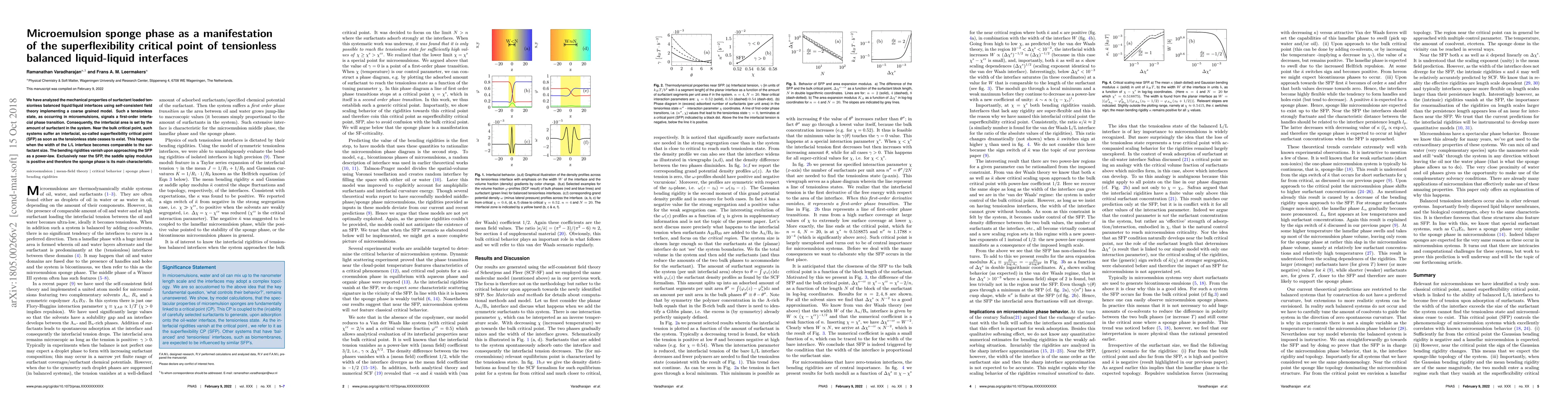 We have analyzed the mechanical properties of surfactant loaded tensionless balanced liquid/liquid interfaces using self-consistent field theory implementing a coarse grained model. Such a tensionless state, as occurring in microemulsions, signals a first-order interfacial phase transition. Consequently, the interfacial area is set by the amount of surfactant in the system. Near the bulk critical point, such systems suffer an interfacial, so-called superflexibility (SF) critical point as soon as the tensionless state ceases to exist. This happens when the width of the L/L interface becomes comparable to the surfactant size. The bending rigidities vanish upon approaching the SF-point as a power-law. Exclusively near the SF-point, the saddle splay modulus is positive featuring the sponge phase to be its main characteristic.