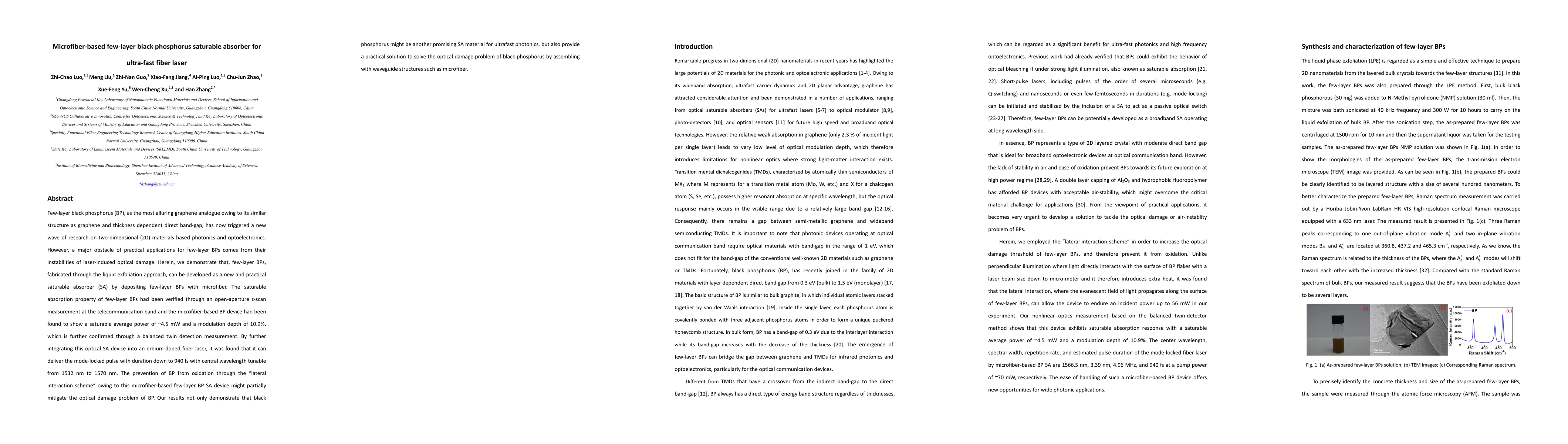 This paper demonstrates the development of a microfiber-based few-layer black phosphorus saturable absorber for ultra-fast fiber lasers, showing a mode-locked pulse duration down to 940 fs. The approach mitigates black phosphorus's optical damage issue through a 'lateral interaction scheme' and suggests it as a promising material for ultrafast photonics.