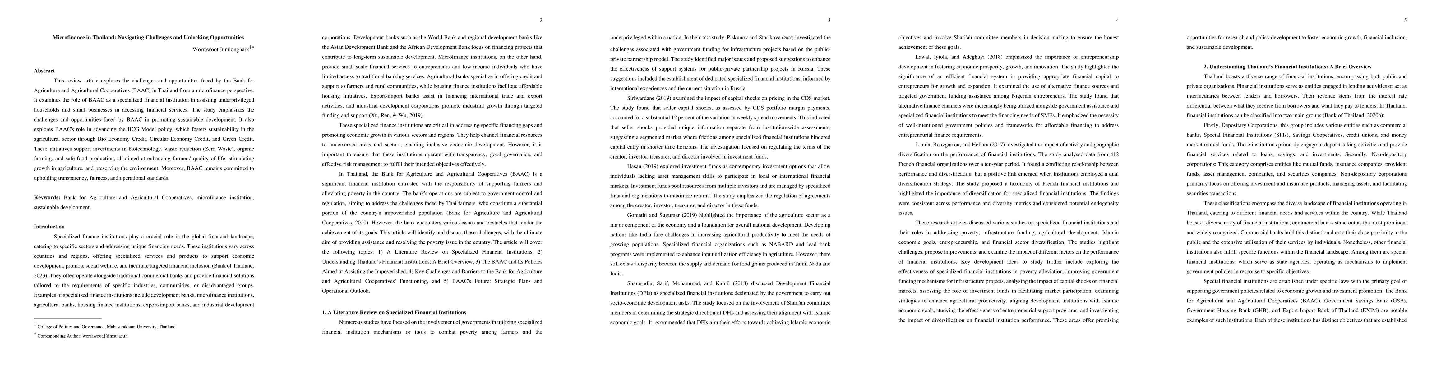 This review article explores the challenges and opportunities faced by the Bank for Agriculture and Agricultural Cooperatives (BAAC) in Thailand from a microfinance perspective. It examines the role of BAAC as a specialized financial institution in assisting underprivileged households and small businesses in accessing financial services. The study emphasizes the challenges and opportunities faced by BAAC in promoting sustainable development. It also explores BAAC's role in advancing the BCG Model policy, which fosters sustainability in the agricultural sector through Bio Economy Credit, Circular Economy Credit, and Green Credit. These initiatives support investments in biotechnology, waste reduction (Zero Waste), organic farming, and safe food production, all aimed at enhancing farmers' quality of life, stimulating growth in agriculture, and preserving the environment. Moreover, BAAC remains committed to upholding transparency, fairness, and operational standards.