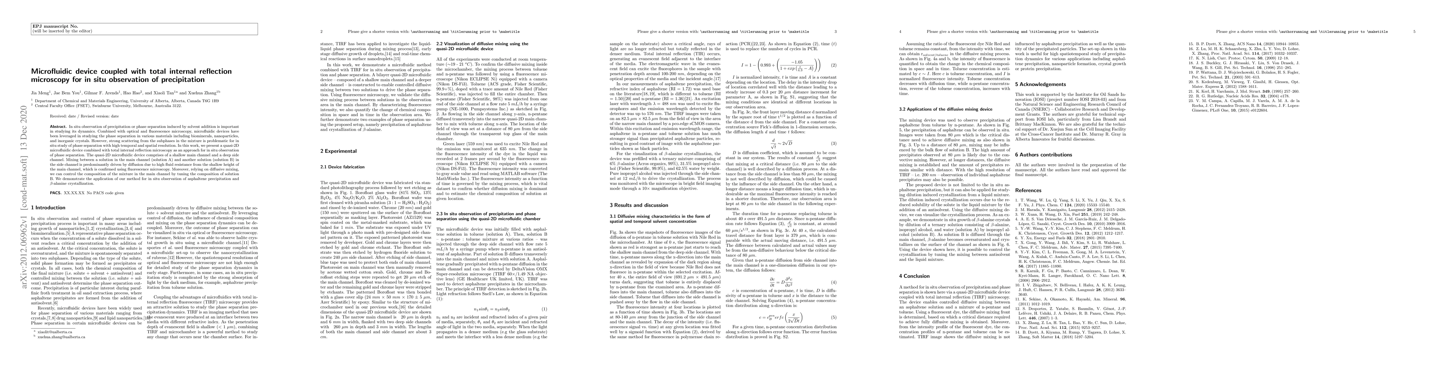 This paper introduces a quasi-2D microfluidic device coupled with total internal reflection microscopy for high-resolution in situ observation of precipitation dynamics. The device enables controlled diffusive mixing, allowing for detailed study of phase separation in biominerals, nanoparticles, and crystals, demonstrated through asphaltene precipitation and beta-alanine crystallization.