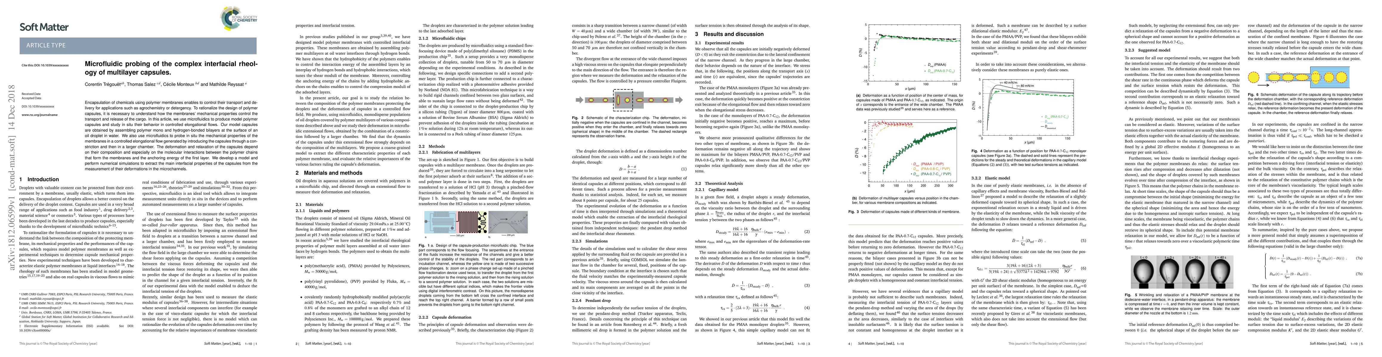 Encapsulation of chemicals using polymer membranes enables to control their transport and delivery for applications such as agrochemistry or detergency. To rationalize the design of polymer capsules, it is necessary to understand how the membranes' mechanical properties control the transport and release of the cargo. In this article, we use microfluidics to produce model polymer capsules and study in situ their behavior in controlled elongational flows. Our model capsules are obtained by assembling polymer mono and hydrogen-bonded bilayers at the surface of an oil droplet in water. We also use microfluidics to probe in situ the mechanical properties of the membranes in a controlled elongational flow generated by introducing the capsules through a constriction and then in a larger chamber. The deformation and relaxation of the capsules depend on their composition and especially on the molecular interactions between the polymer chains that form the membranes and the anchoring energy of the first layer. We develop a model and perform numerical simulations to extract the main interfacial properties of the capsules from the measurement of their deformations in the microchannels.