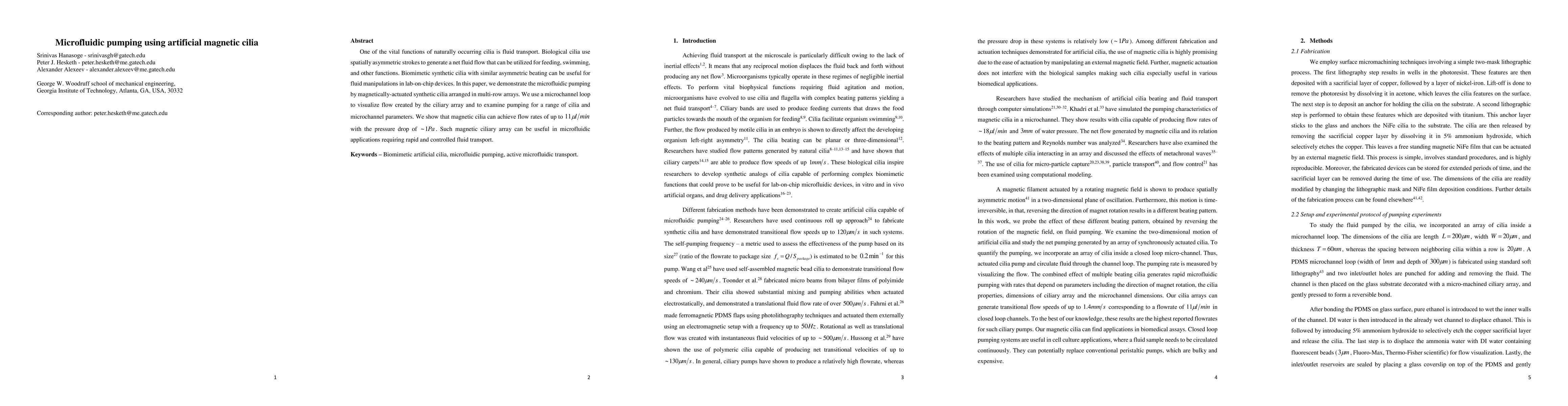 This paper demonstrates microfluidic pumping using magnetically actuated artificial cilia in multi-row arrays, achieving flow rates up to 11 μl/min with a pressure drop of ~1 Pa. The study shows potential for rapid and controlled fluid transport in lab-on-chip devices.