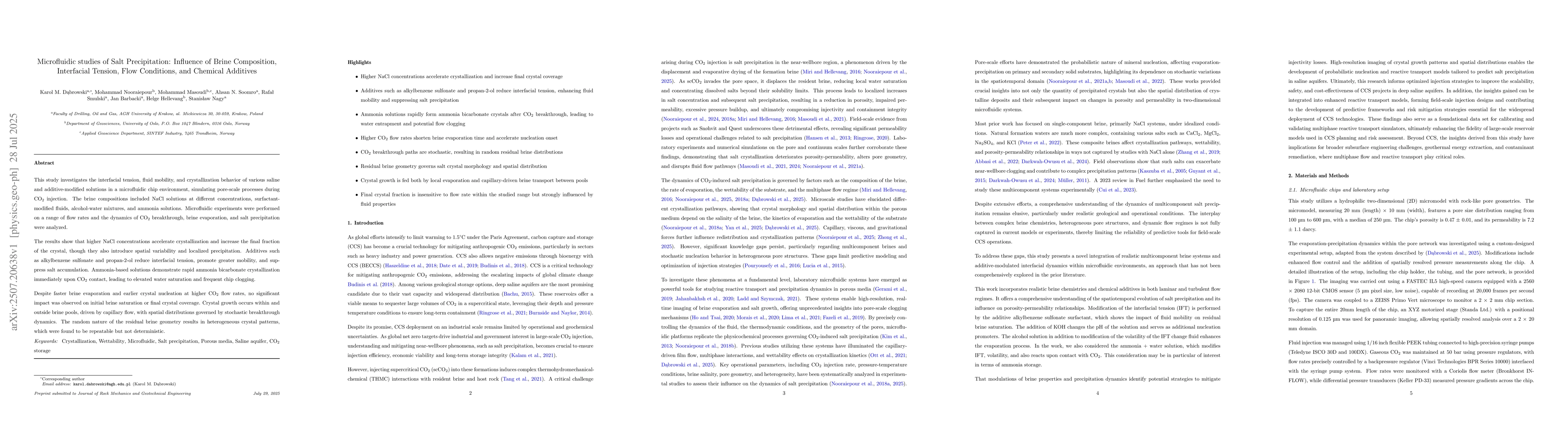 This study investigates the interfacial tension, fluid mobility, and crystallization behavior of various saline and additive-modified solutions in a microfluidic chip environment, simulating pore-scale processes during CO2 injection. The brine compositions included NaCl solutions at different concentrations, surfactant-modified fluids, alcohol-water mixtures, and ammonia solutions. Microfluidic experiments were performed on a range of flow rates and the dynamics of CO2 breakthrough, brine evaporation, and salt precipitation were analyzed. The results show that higher NaCl concentrations accelerate crystallization and increase the final fraction of the crystal, though they also introduce spatial variability and localized precipitation. Additives such as alkylbenzene sulfonate and propan-2-ol reduce interfacial tension, promote greater mobility, and suppress salt accumulation. Ammonia-based solutions demonstrate rapid ammonia bicarbonate crystallization immediately upon CO2 contact, leading to elevated water saturation and frequent chip clogging. Despite faster brine evaporation and earlier crystal nucleation at higher CO2 flow rates, no significant impact was observed on initial brine saturation or final crystal coverage. Crystal growth occurs within and outside brine pools, driven by capillary flow, with spatial distributions governed by stochastic breakthrough dynamics. The random nature of the residual brine geometry results in heterogeneous crystal patterns, which were found to be repeatable but not deterministic.