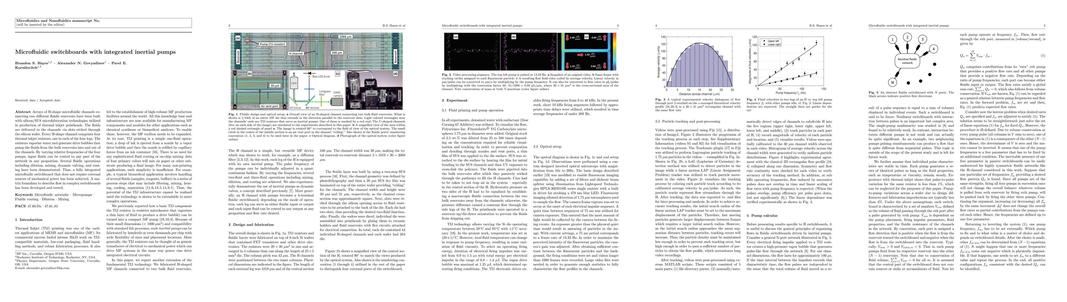 Arrays of H-shape microfluidic channels connecting two different fluidic reservoirs have been built with silicon/SU8 microfabrication technologies utilized in production of thermal inkjet printheads. The fluids are delivered to the channels via slots etched through the silicon wafer. Every H-shape channel comprises four thermal inkjet resistors, one in each of the four legs. The resistors vaporize water and generate drive bubbles that pump the fluids from the bulk reservoirs into and out of the channels. By varying relative frequencies of the four pumps, input fluids can be routed to any part of the network in any proportion. Several fluidic operations including dilution, mixing, dynamic valving, and routing have been demonstrated. Thus, a fully integrated microfluidic switchboard that does not require external sources of mechanical power has been achieved. A matrix formalism to describe flow in complex switchboards has been developed and tested.