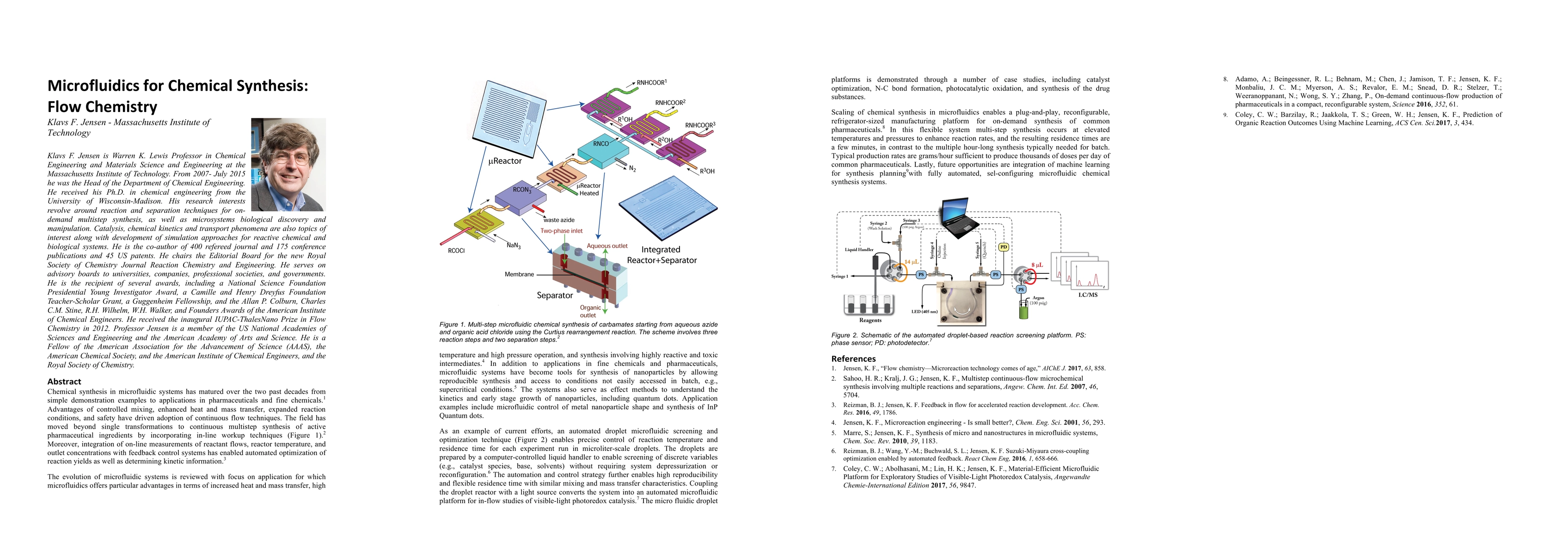 Klavs F. Jensen is Warren K. Lewis Professor in Chemical Engineering and Materials Science and Engineering at the Massachusetts Institute of Technology. Here he describes the use of microfluidics for chemical synthesis, from the early demonstration examples to the current efforts with automated droplet microfluidic screening and optimization techniques.