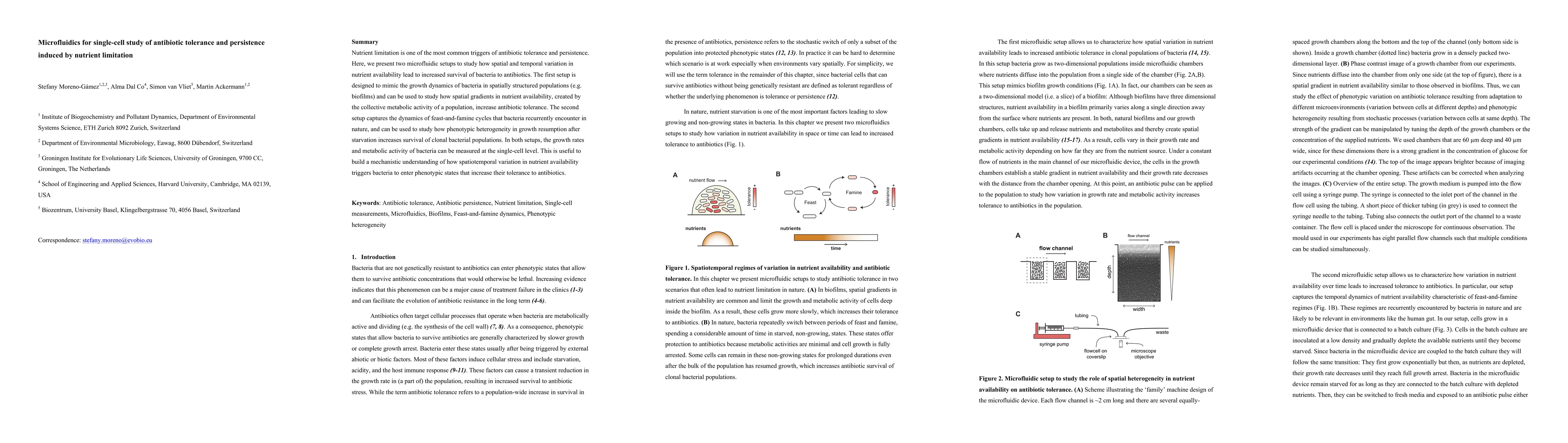 This paper introduces microfluidic systems to study bacterial antibiotic tolerance and persistence under nutrient limitation, focusing on spatial and temporal nutrient variations. The setups allow single-cell level analysis of bacterial growth and metabolic activity to understand how nutrient dynamics influence antibiotic tolerance.