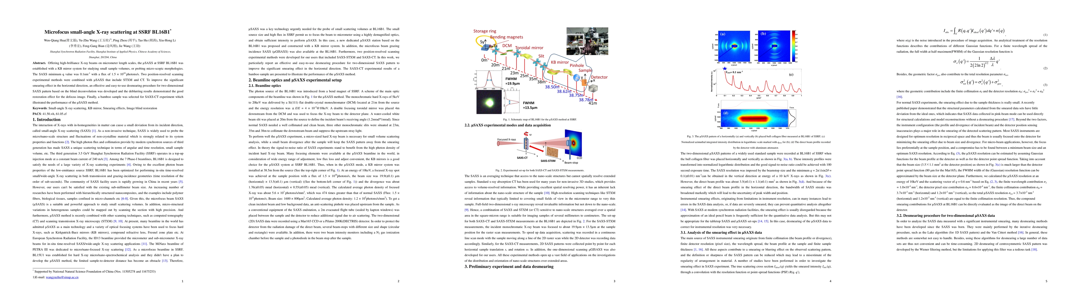 The research paper details the development of a high-brilliance microfocus small-angle X-ray scattering (SAXS) system at SSRF BL16B1, utilizing a KB mirror system for micrometer-scale sample analysis. A desmearing procedure based on blind deconvolution was introduced to address defocus smearing, significantly improving SAXS pattern quality. The method's effectiveness was demonstrated using a bamboo sample for SAXS-CT experimentation.