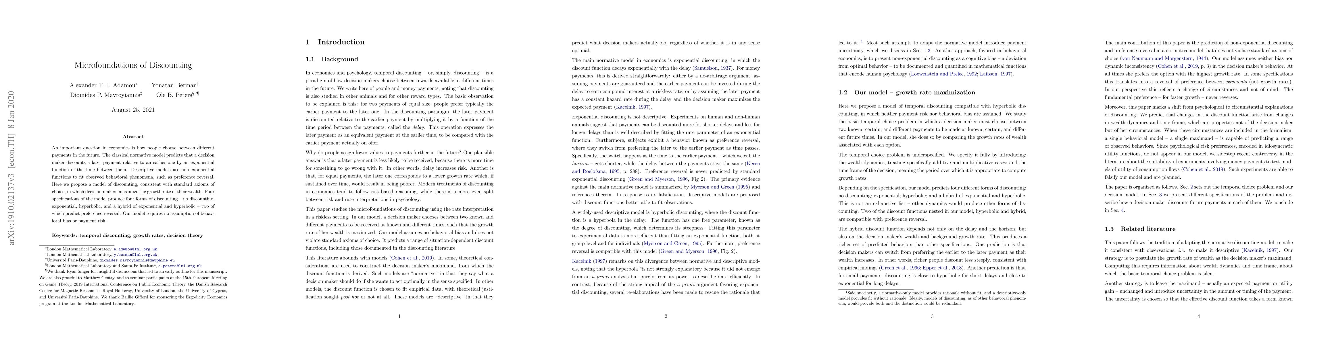 This paper proposes a microfoundation model of discounting where decision makers maximize wealth growth rate, leading to four discounting forms: no discounting, exponential, hyperbolic, and a hybrid. It aligns with choice axioms and predicts preference reversal without assuming behavioral bias or payment risk.