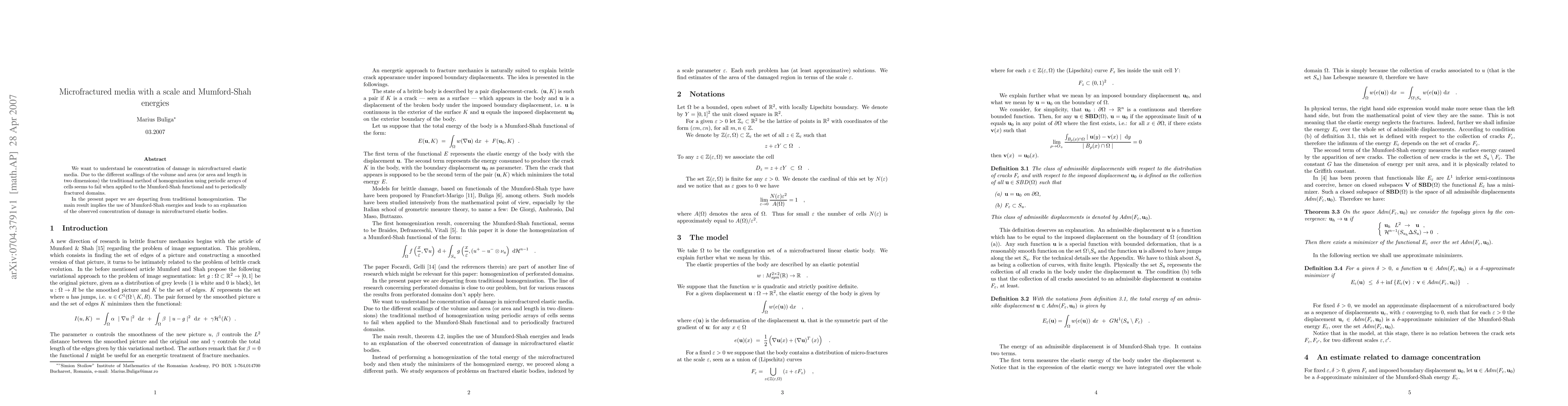 We want to understand he concentration of damage in microfractured elastic media. Due to the different scallings of the volume and area (or area and length in two dimensions) the traditional method of homogenization using periodic arrays of cells seems to fail when applied to the Mumford-Shah functional and to periodically fractured domains. In the present paper we are departing from traditional homogenization. The main result implies the use of Mumford-Shah energies and leads to an explanation of the observed concentration of damage in microfractured elastic bodies.