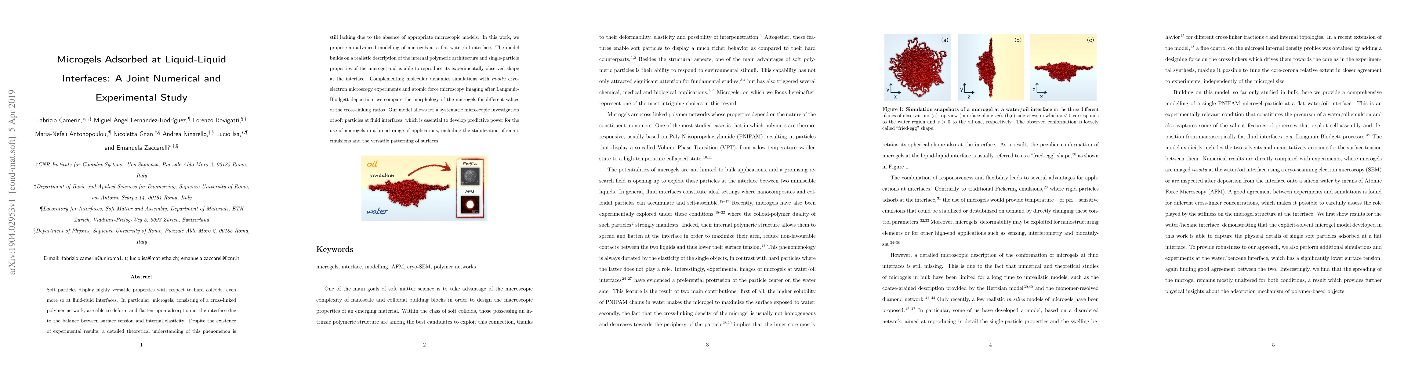 This paper proposes an advanced theoretical model to understand microgels adsorbed at liquid-liquid interfaces, combining molecular dynamics simulations and experimental techniques. The study reveals how microgels deform and flatten due to surface tension and internal elasticity, providing insights into their potential applications in emulsion stabilization and surface patterning.