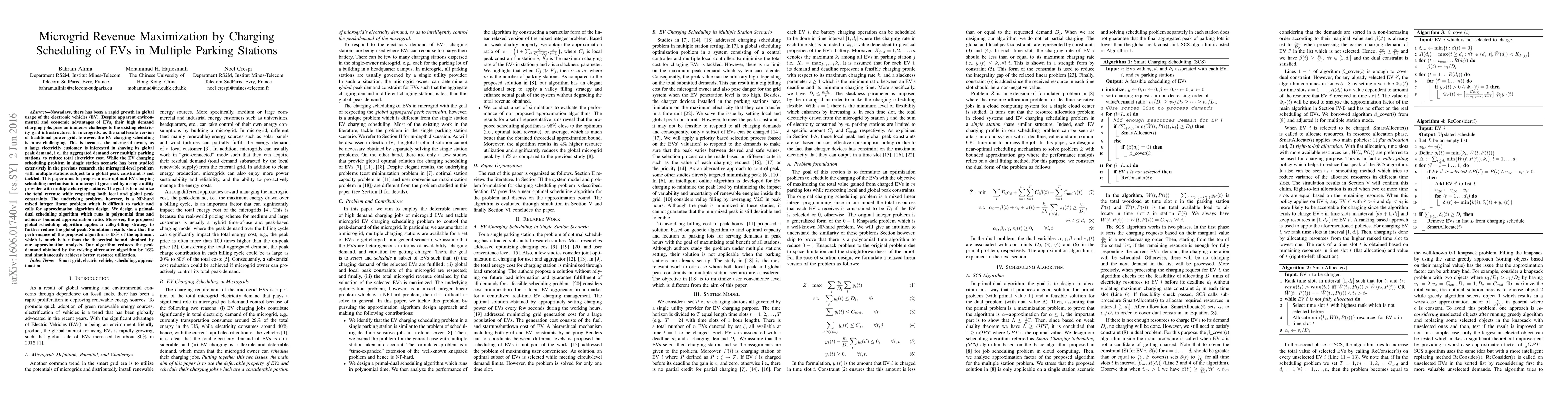 This paper proposes a near-optimal algorithm for EV charging scheduling in microgrids with multiple parking stations to maximize revenue while managing local and global peak demand constraints. The developed primal-dual scheduling algorithm achieves a bounded approximation ratio and reduces peak demand by 16% compared to existing methods, demonstrating near-optimal performance.