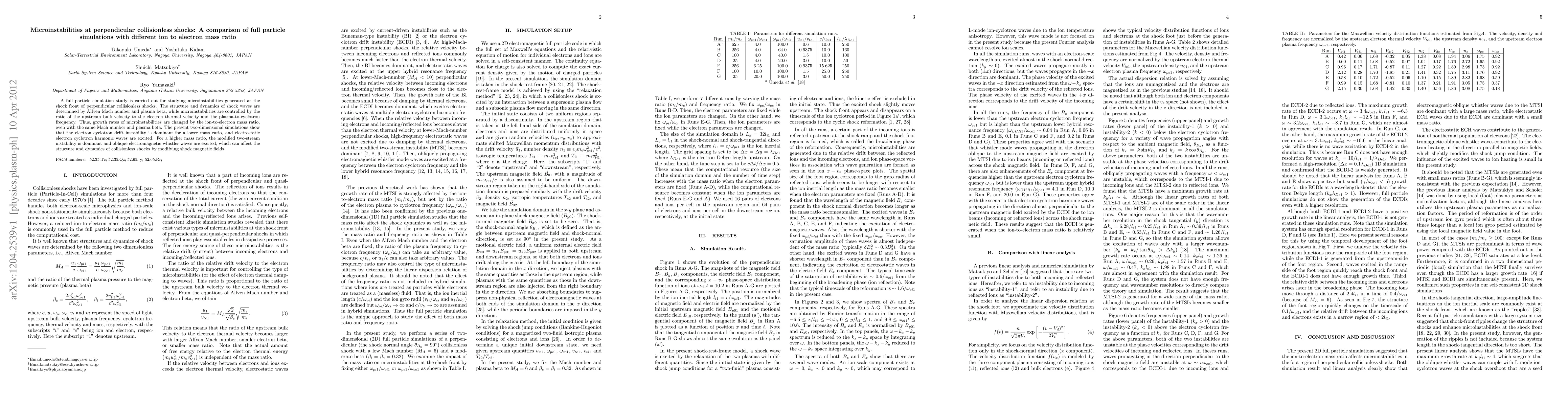This paper compares full particle simulations of microinstabilities at perpendicular collisionless shocks, finding that the ion-to-electron mass ratio significantly influences the growth rates and types of instabilities, with electron cyclotron drift instability dominating at lower mass ratios and modified two-stream instability at higher mass ratios.