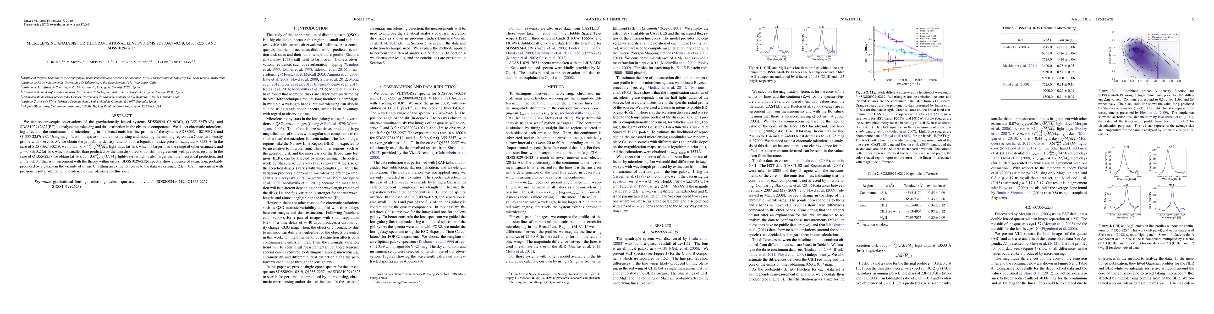We use spectroscopic observations of the gravitationally lensed systems SDSS0924+0219(BC), Q1355-2257(AB), and SDSS1029+2623(BC) to analyze microlensing and dust extinction in the observed components. We detect chromatic microlensing effects in the continuum and microlensing in the broad emission line profiles of the systems SDSS0924+0219(BC), and Q1355-2257(AB). Using magnification maps to simulate microlensing and modeling the emitting region as a Gaussian intensity profile with size $r_s \propto \lambda ^p$, we obtain the probability density functions for a logarithmic size prior at $\lambda_{rest-frame}=3533$ {\AA}. In the case of SDSS0924+0219, we obtain: $r_s = 4^{+3}_{-2}$ $\sqrt{M/M_{\odot}}$ light-days (at $1 \sigma$), which is larger than the range of other estimates, and $p = 0.8 \pm 0.2$ (at $1 \sigma$), which is smaller than predicted by the thin disk theory, but still in agreement with previous results. In the case of Q1355-2257 we obtain (at $1 \sigma$): $r_s = 3.6^{+3.0}_{-1.6}$ $\sqrt{M/M_{\odot}}$ light-days, which is also larger than the theoretical prediction, and $p = 2.0 \pm 0.7$ that is in agreement with the theory within errors. SDSS1029+2326 spectra show evidence of extinction, probably produced by a galaxy in the vicinity of image C. Fitting an extinction curve to the data we estimate $\Delta E \sim 0.2$ in agreement with previous results. We found no evidence of microlensing for this system.