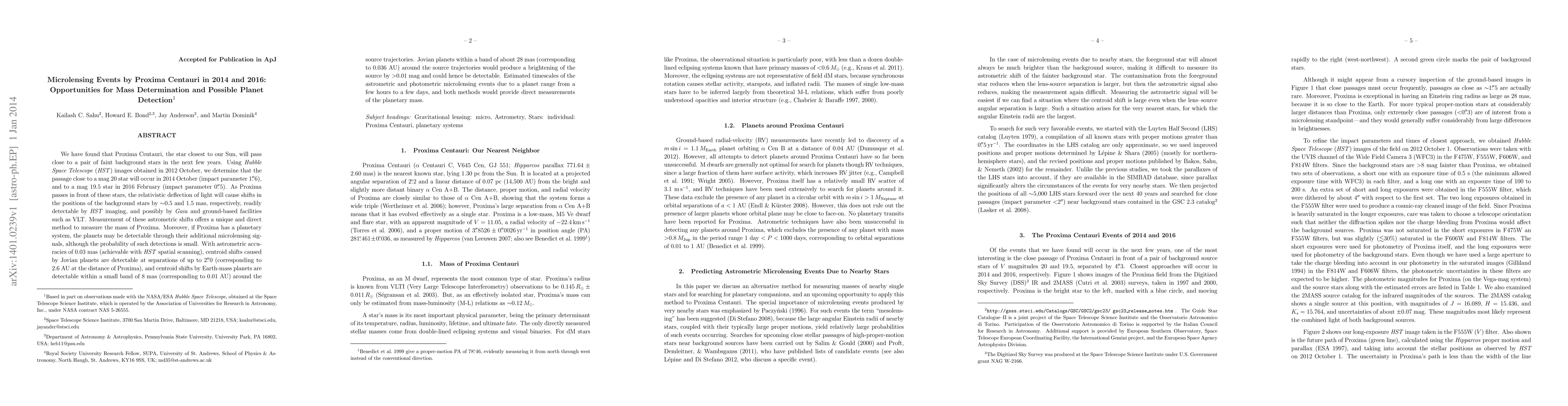 This paper discusses the upcoming microlensing events by Proxima Centauri in 2014 and 2016, which will allow precise measurements of its mass and potentially reveal planets through additional microlensing signals. The events offer a unique astrometric method to detect and measure the mass of planets, with the Hubble Space Telescope and other ground-based facilities poised to capture the necessary data.