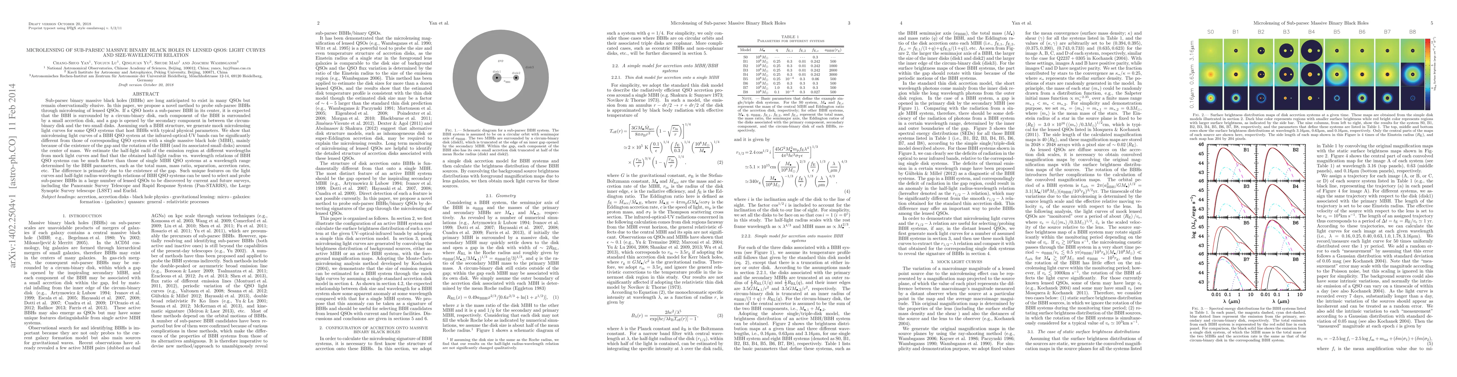 This paper proposes a method to detect sub-parsec binary massive black holes (BBHs) in lensed QSOs via microlensing, showing that BBH systems produce distinct microlensing light curves and size-wavelength relations compared to single massive black holes due to the presence of gaps and rotational dynamics. These unique features can help identify BBHs in numerous lensed QSOs observed by upcoming surveys.