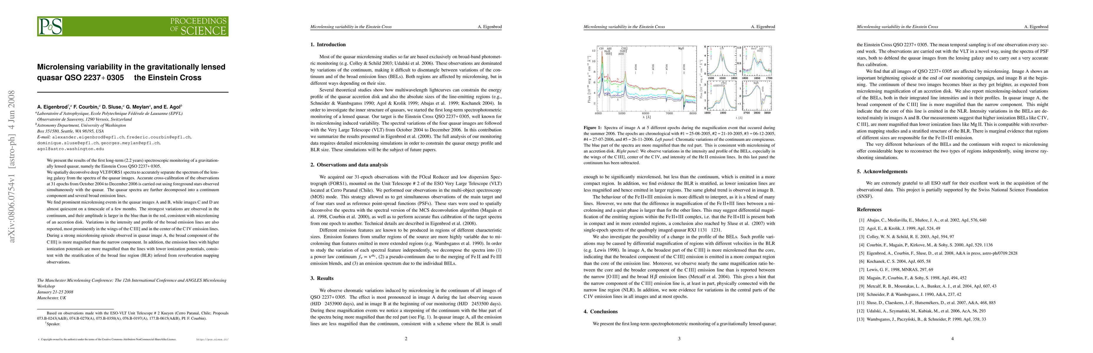 We present the results of the first long-term (2.2 years) spectroscopic monitoring of a gravitationally lensed quasar, namely the Einstein Cross Q2237+0305. We spatially deconvolve deep VLT/FORS1 spectra to accurately separate the spectrum of the lensing galaxy from the spectra of the quasar images. Accurate cross-calibration of the observations at 31 epochs from October 2004 to December 2006 is carried out using foreground stars observed simultaneously with the quasar. The quasar spectra are further decomposed into a continuum component and several broad emission lines. We find prominent microlensing events in the quasar images A and B, while images C and D are almost quiescent on a timescale of a few months. The strongest variations are observed in the continuum, and their amplitude is larger in the blue than in the red, consistent with microlensing of an accretion disk. Variations in the intensity and profile of the broad emission lines are also reported, most prominently in the wings of the CIII] and in the center of the CIV emission lines. During a strong microlensing episode observed in quasar image A, the broad component of the CIII] is more magnified than the narrow component. In addition, the emission lines with higher ionization potentials are more magnified than the lines with lower ionization potentials, consistent with the stratification of the broad line region (BLR) infered from reverberation mapping observations.
