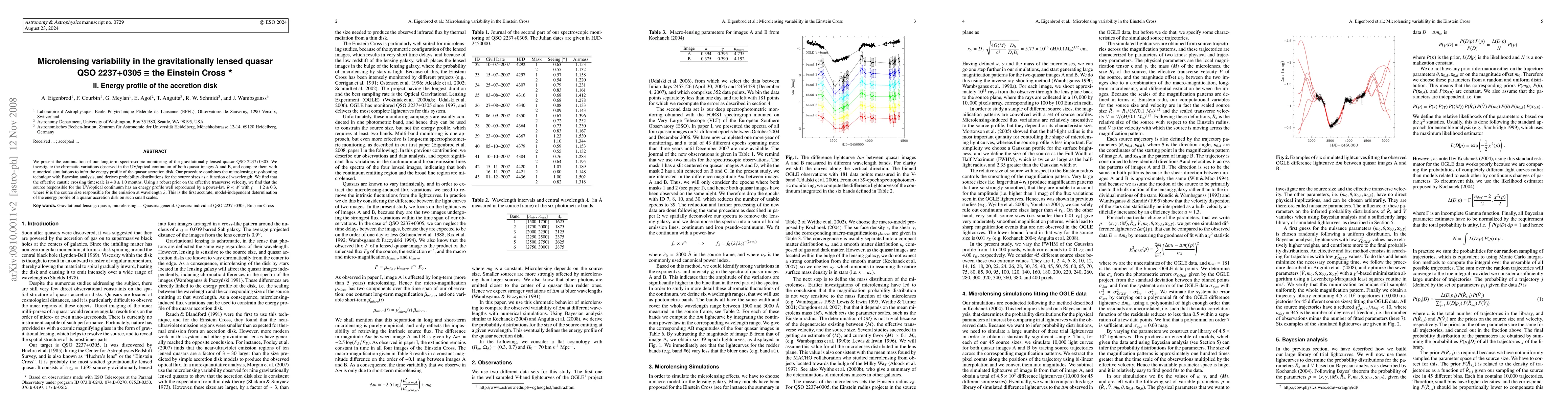 This paper continues spectroscopic monitoring of the lensed quasar QSO 2237+0305, revealing chromatic variations in its UV/optical continuum. The study combines microlensing and Bayesian analysis to determine the quasar's accretion disk energy profile, finding it follows a power-law R λ^1.2±0.3.