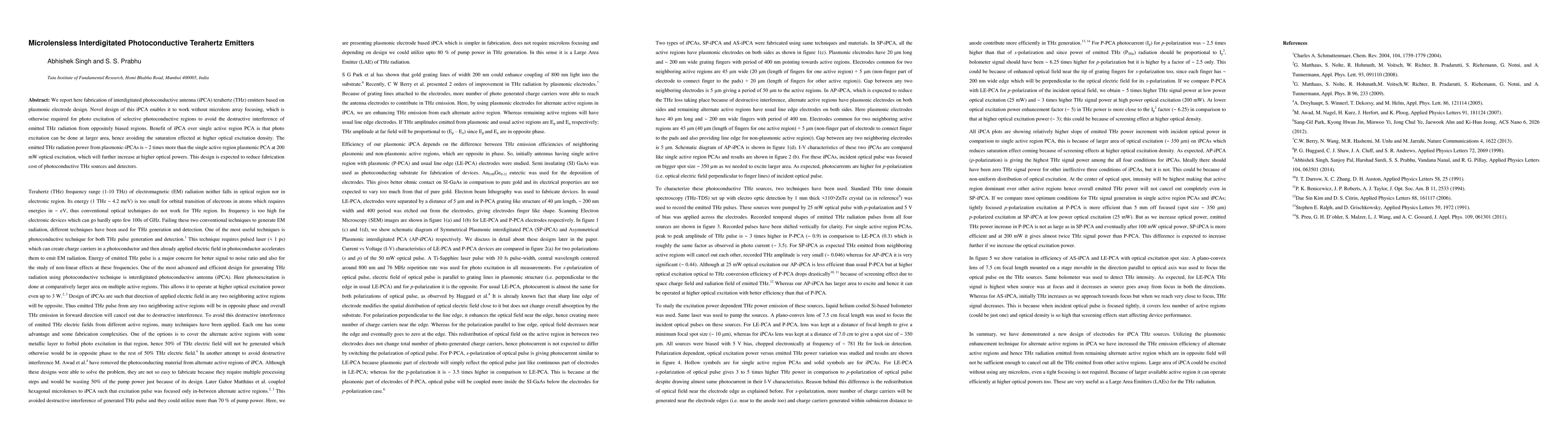 This paper describes the fabrication of interdigitated photoconductive antenna terahertz emitters using a novel plasmonic electrode design, eliminating the need for microlens focusing. The design allows for larger area photo excitation, resulting in higher emitted THz radiation power and reduced fabrication costs compared to single active region designs.