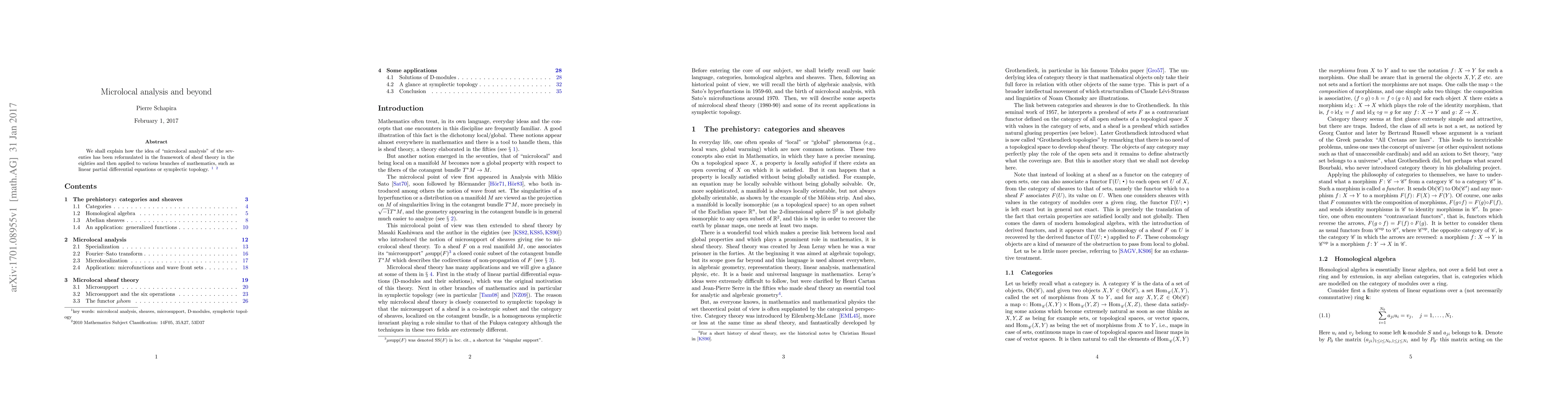 Summary: This paper reformulates microlocal analysis from the 1970s within the framework of sheaf theory in the 1980s and applies it to diverse fields like linear partial differential equations and symplectic topology. The work highlights the evolution and expanded utility of microlocal analysis.