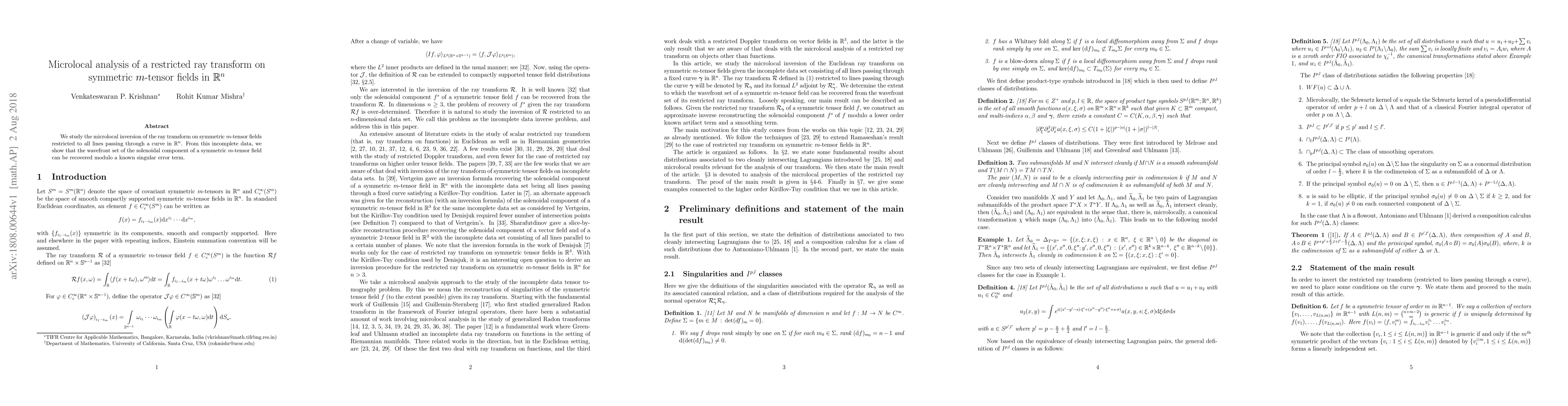 This paper investigates the microlocal inversion of a restricted ray transform for symmetric $m$-tensor fields in $\mathbb{R}^n$, demonstrating that the wavefront set of the solenoidal component can be reconstructed from incomplete data, up to a known singular error term.