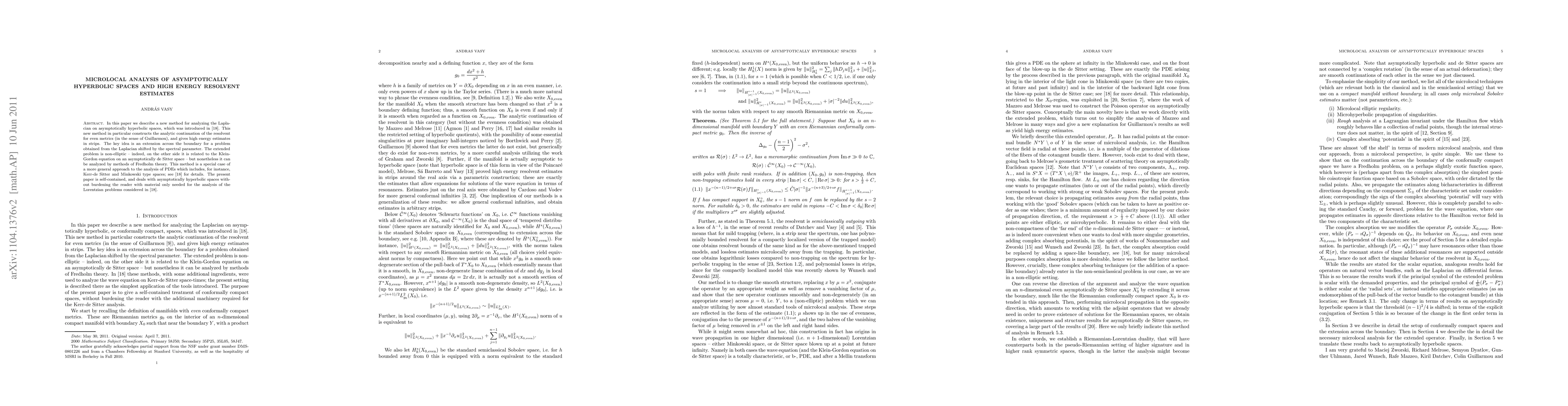 This paper introduces a novel method for analyzing the Laplacian on asymptotically hyperbolic spaces, constructing the analytic continuation of the resolvent and providing high energy estimates. The approach extends across the boundary using Fredholm theory, applicable to a broader range of PDEs including Kerr-de Sitter and Minkowski spaces.