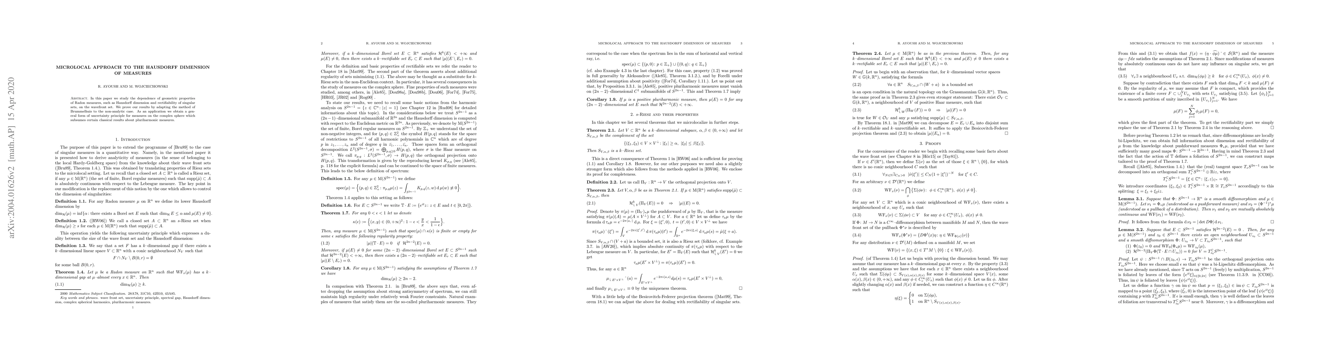 In this paper we study the dependence of geometric properties of Radon measures, such as Hausdorff dimension and rectifiability of singular sets, on the wavefront set. This is achieved by adapting the method of Brummelhuis to the non-analytic case. As an application we obtain a general form of uncertainty principle for measures on the complex sphere which subsumes certain classical results about pluriharmonic measures.