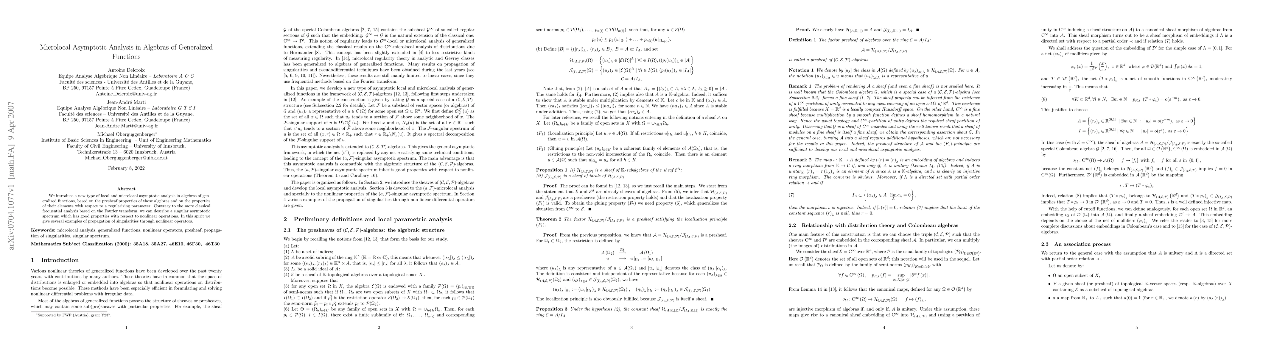 This paper introduces a novel microlocal asymptotic analysis in algebras of generalized functions, emphasizing presheaf properties and singular asymptotic spectra. Unlike classical Fourier-based analysis, this approach effectively describes singularities and their propagation through nonlinear operators.