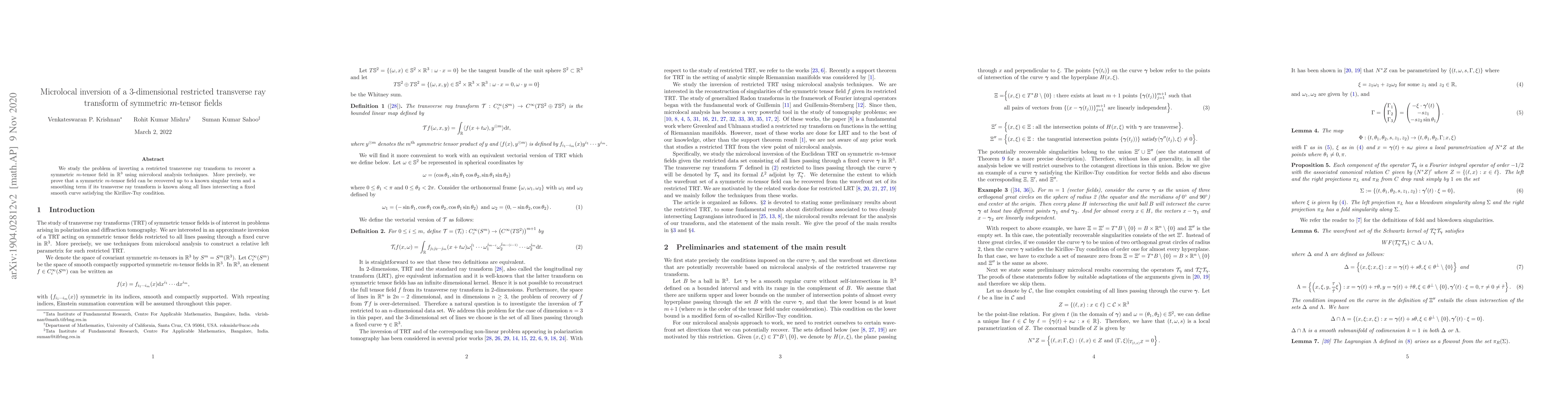 This paper explores the inversion of a 3D restricted transverse ray transform for symmetric $m$-tensor fields using microlocal analysis. It proves that such tensor fields can be reconstructed up to a singular and a smoothing term when the transform is known along lines intersecting a fixed smooth curve.