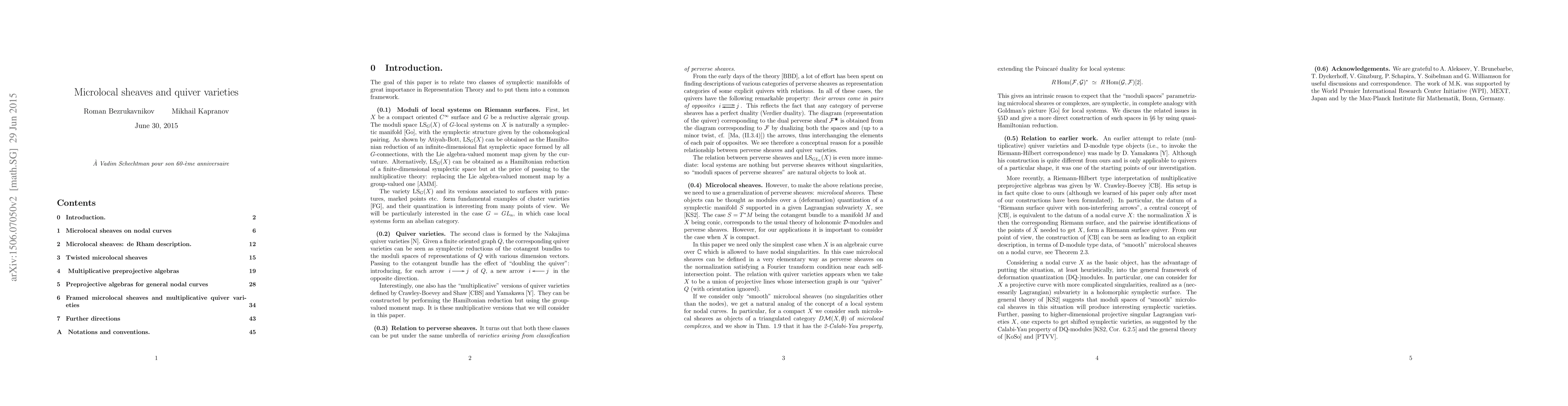 We relate Nakajima Quiver Varieties (or, rather, their multiplicative version) with moduli spaces of perverse sheaves. More precisely, we consider a generalization of the concept of perverse sheaves: microlocal sheaves on a nodal curve X. They are defined as perverse sheaves on normalization of X with a Fourier transform condition near each node and form an abelian category M(X). One has a similar triangulated category DM(X) of microlocal complexes. For a compact X we show that DM(X) is Calabi-Yau of dimension 2. In the case when all components of X are rational, M(X) is equivalent to the category of representations of the multiplicative pre-projective algebra associated to the intersection graph of X. Quiver varieties in the proper sense are obtained as moduli spaces of microlocal sheaves with a framing of vanishing cycles at singular points. The case when components of X have higher genus, leads to interesting generalizations of preprojective algebras and quiver varieties. We analyze them from the point of view of pseudo-Hamiltonian reduction and group-valued moment maps.