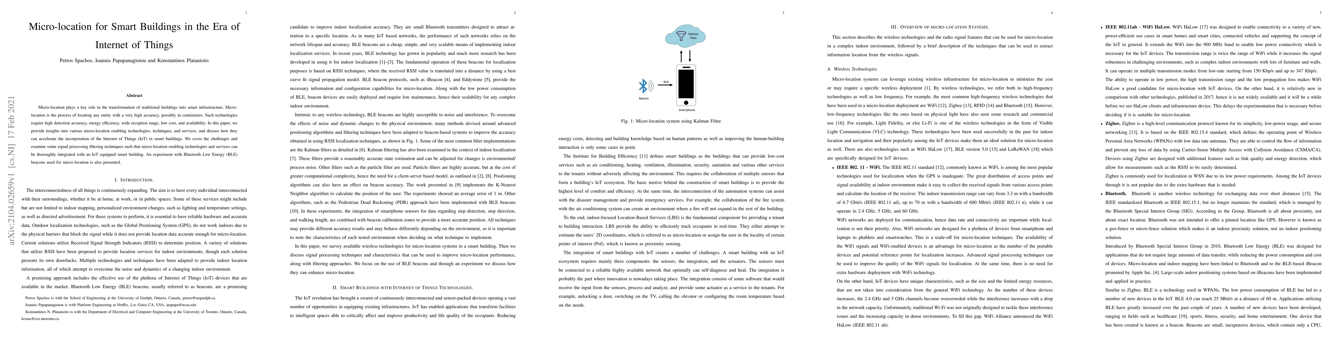 Microlocation plays a key role in the transformation of traditional buildings into smart infrastructure. Microlocation is the process of locating any entity with a very high accuracy, possibly in centimeters. Such technologies require high detection accuracy, energy efficiency, wide reception range, low cost, and availability. In this article, we provide insights into various microlocation-enabling technologies, techniques, and services and discuss how they can accelerate the incorporation of the Internet of Things (IoT) in smart buildings. We cover the challenges and examine some signal processing filtering techniques such that microlocation-enabling technologies and services can be thoroughly integrated with an IoT-equipped smart building. An experiment with Bluetooth Low-Energy (BLE) beacons used for microlocation is also presented.