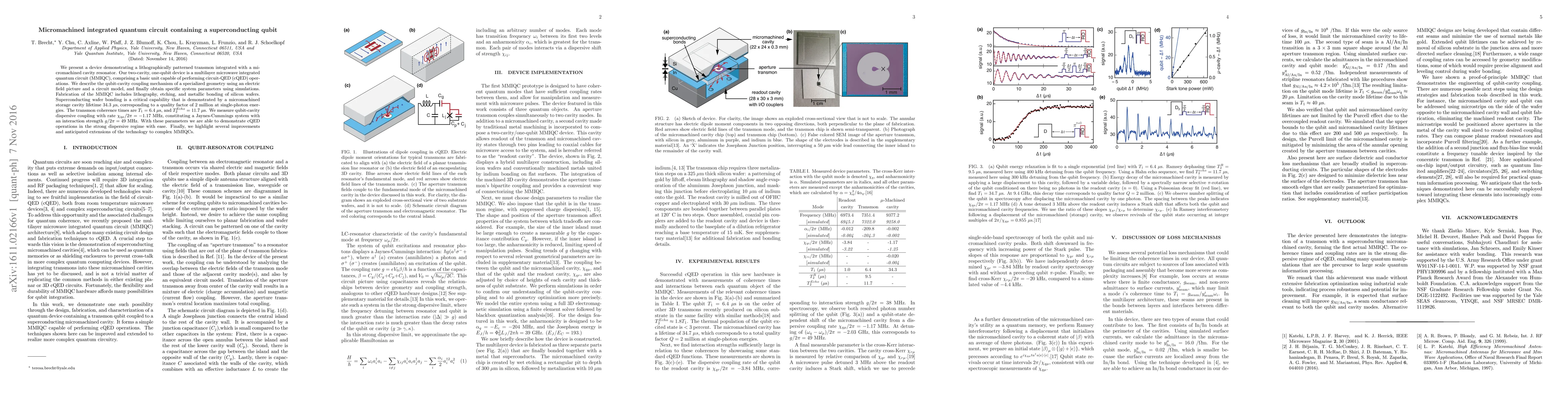 This research paper presents a micromachined integrated quantum circuit with a superconducting qubit, demonstrating a two-cavity system for performing circuit-QED operations with improved coherence times and dispersive coupling.