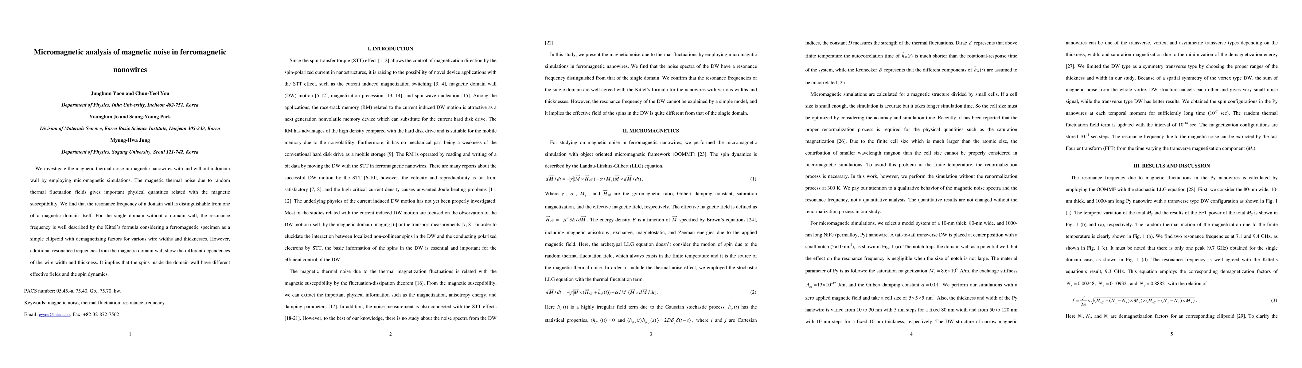 This study uses micromagnetic simulations to analyze magnetic thermal noise in ferromagnetic nanowires, revealing distinct resonance frequencies for domain walls compared to single magnetic domains. The findings show that domain walls exhibit unique spin dynamics and effective fields, differing from the Kittel's formula predictions for single domains.