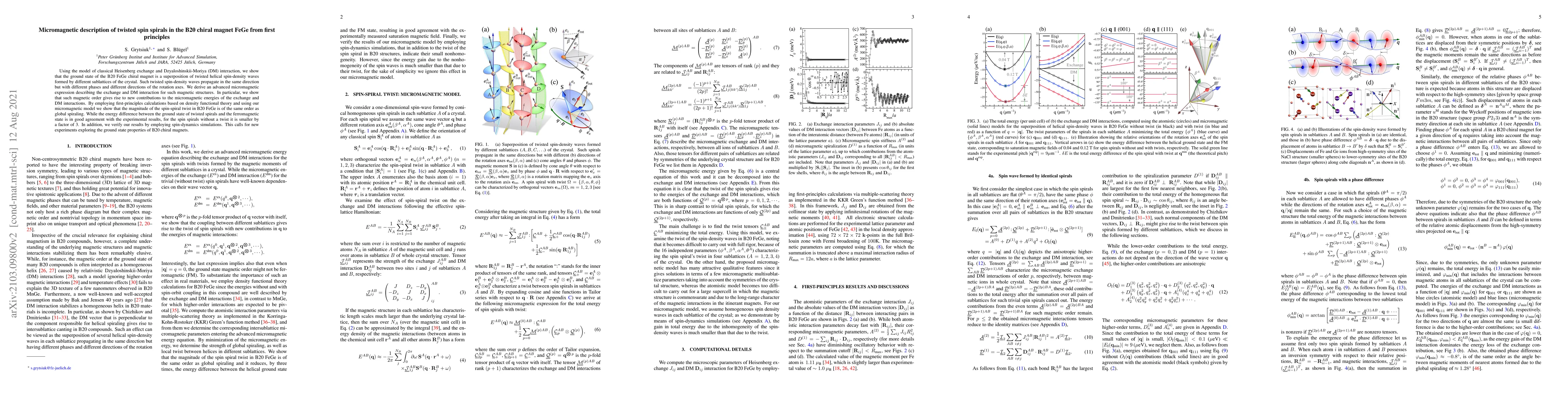 This paper presents a micromagnetic model for twisted spin spirals in the B20 chiral magnet FeGe, showing that its ground state consists of helical spin-density waves with different phases and rotation axes. The study uses first-principles calculations and density functional theory to validate the model and suggests new experimental directions to explore these magnetic structures.