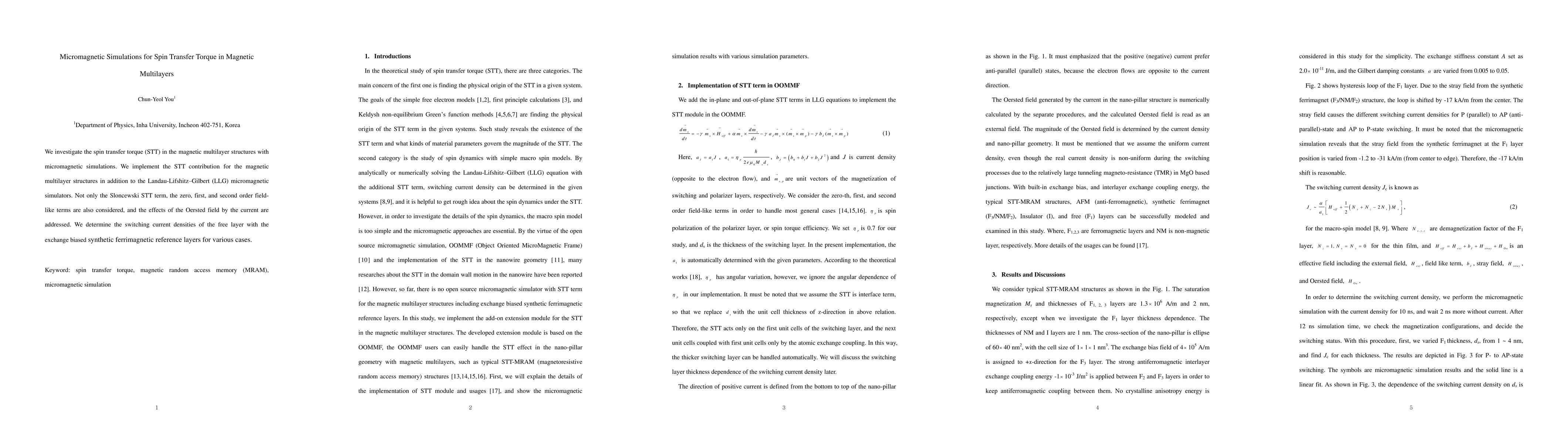 This paper uses micromagnetic simulations to study spin transfer torque (STT) in magnetic multilayer structures, incorporating various STT terms and Oersted field effects. The study determines the switching current densities for free layers with exchange-biased synthetic ferrimagnetic reference layers.