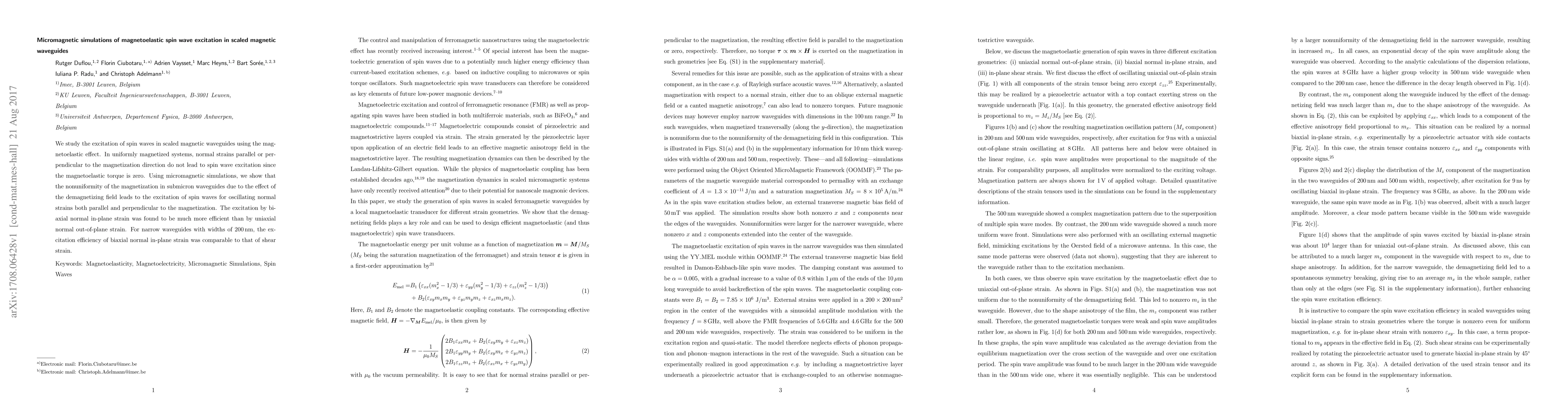 This paper uses micromagnetic simulations to demonstrate the excitation of spin waves in submicron magnetic waveguides via magnetoelastic effects. It reveals that nonuniform magnetization due to demagnetizing fields can induce spin wave excitation by oscillating normal strains, with biaxial in-plane strain being significantly more efficient than uniaxial out-of-plane strain.