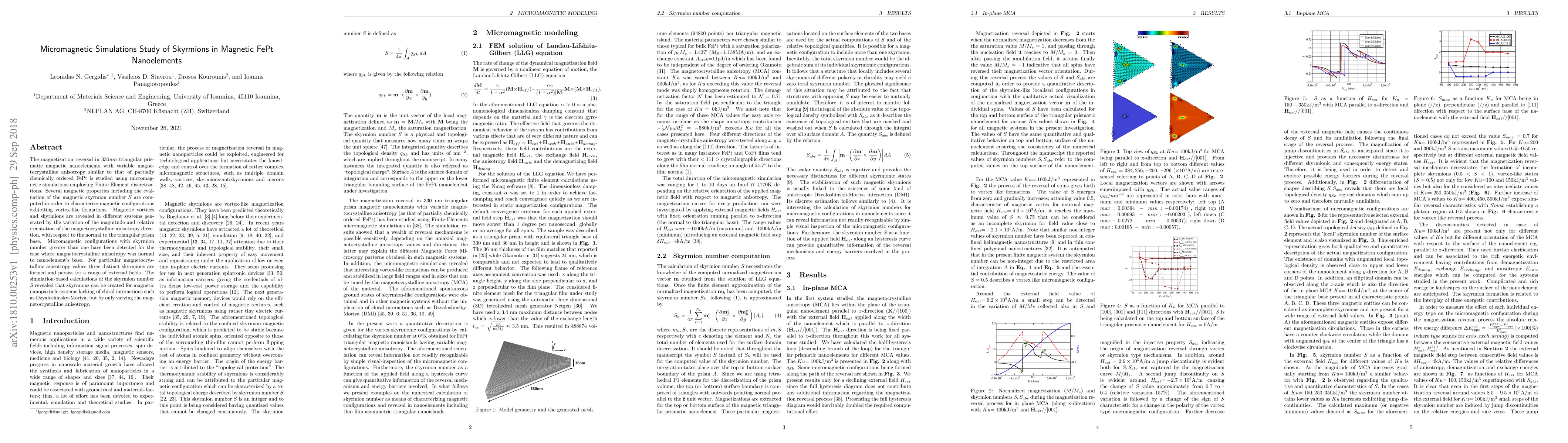 This study uses micromagnetic simulations to investigate magnetization reversal in FePt nanoelements, revealing the formation of magnetic skyrmions influenced by varying magnetocrystalline anisotropy. The results show that skyrmions can form without chiral interactions, solely through anisotropy adjustments.