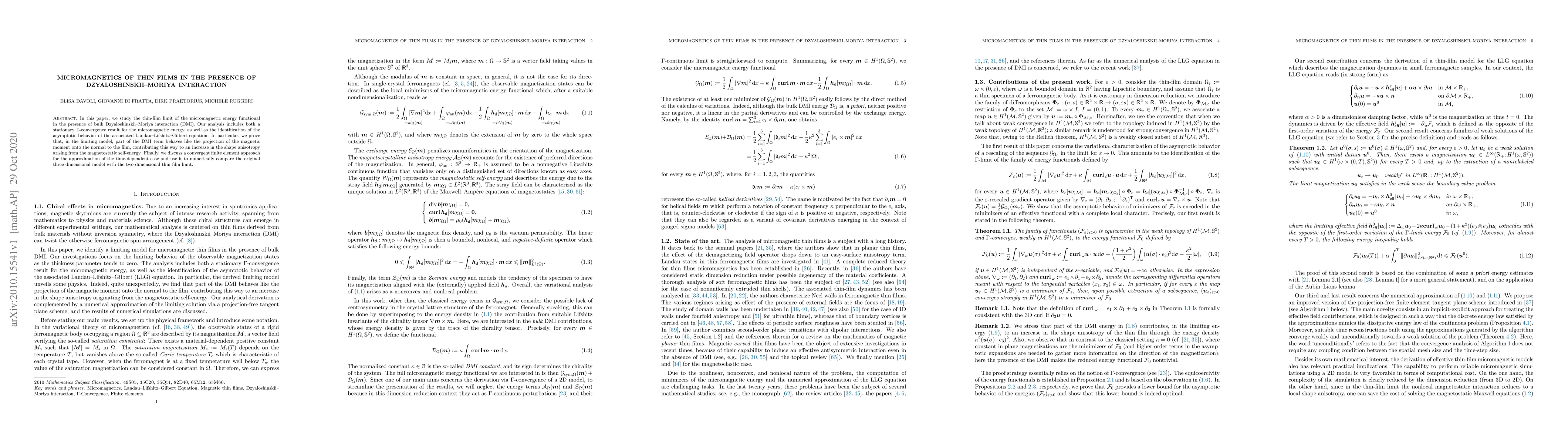 This paper examines the micromagnetic energy in thin films under the influence of Dzyaloshinskii-Moriya interaction (DMI), demonstrating that DMI contributes to an increase in shape anisotropy. It also presents a finite element method for approximating the time-dependent model and compares it numerically with a three-dimensional model.