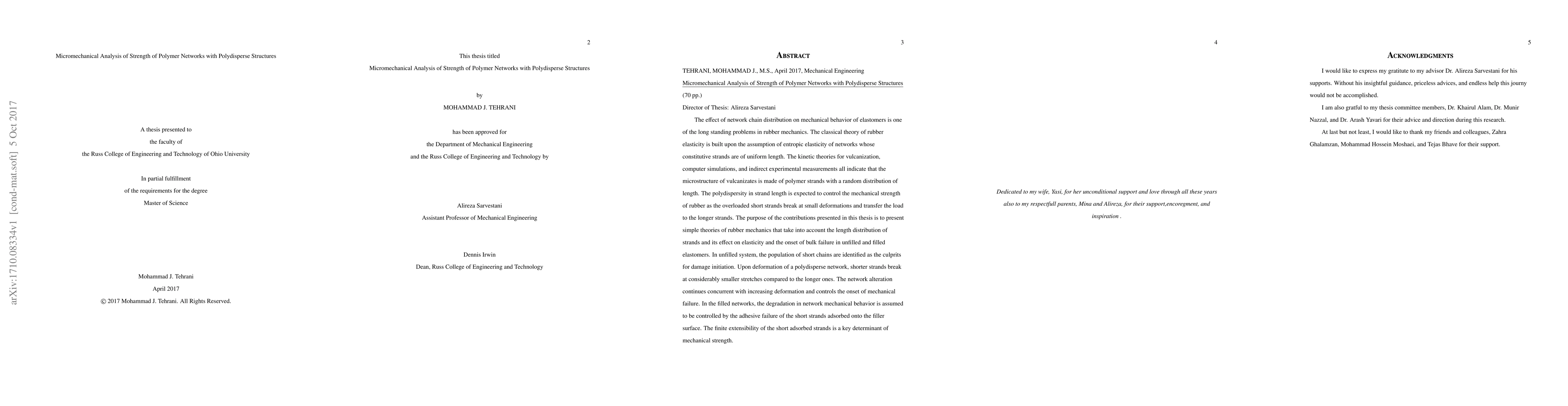 The effect of network chain distribution on the mechanical behavior of elastomers is one of the long-standing problems in rubber mechanics. The classical theory of rubber elasticity is built upon the assumption of entropic elasticity of networks whose constitutive strands are of uniform length. The kinetic theories for vulcanization, computer simulations, and indirect experimental measurements all indicate that the microstructure of vulcanizates is made of polymer strands with a random distribution of length. The polydispersity in strand length is expected to control the mechanical strength of rubber as the overloaded short strands break at small deformations and transfer the load to the longer strands. The purpose of the contributions presented in this thesis is to present simple theories of rubber mechanics that take into account the length distribution of strands and its effect on elasticity and the onset of bulk failure in unfilled and filled elastomers. In unfilled system, the population of short chains is identified as the culprits for damage initiation. Upon deformation of a polydisperse network, shorter strands break at considerably smaller stretches compared to the longer ones. The network alteration continues concurrent with increasing deformation and controls the onset of mechanical failure. In the filled networks, the degradation in network mechanical behavior is assumed to be controlled by the adhesive failure of the short strands adsorbed onto the filler surface. The finite extensibility of the short adsorbed strands is a key determinant of mechanical strength.