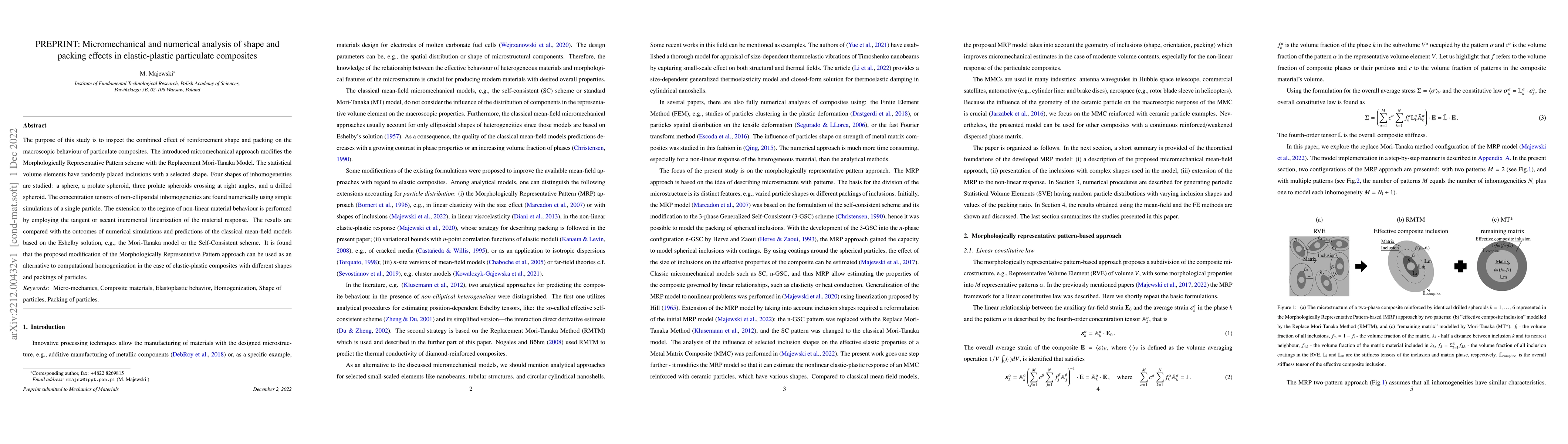 The purpose of this study is to inspect the combined effect of reinforcement shape and packing on the macroscopic behaviour of particulate composites. The introduced micromechanical approach modifies the Morphologically Representative Pattern scheme with the Replacement Mori-Tanaka Model. The statistical volume elements have randomly placed inclusions with a selected shape. Four shapes of inhomogeneities are studied: a sphere, a prolate spheroid, three prolate spheroids crossing at right angles, and a drilled spheroid. The concentration tensors of non-ellipsoidal inhomogeneities are found numerically using simple simulations of a single particle. The extension to the regime of non-linear material behaviour is performed by employing the tangent or secant incremental linearization of the material response. The results are compared with the outcomes of numerical simulations and predictions of the classical mean-field models based on the Eshelby solution, e.g., the Mori-Tanaka model or the Self-Consistent scheme. It is found that the proposed modification of the Morphologically Representative Pattern approach can be used as an alternative to computational homogenization in the case of elastic-plastic composites with different shapes and packings of particles.